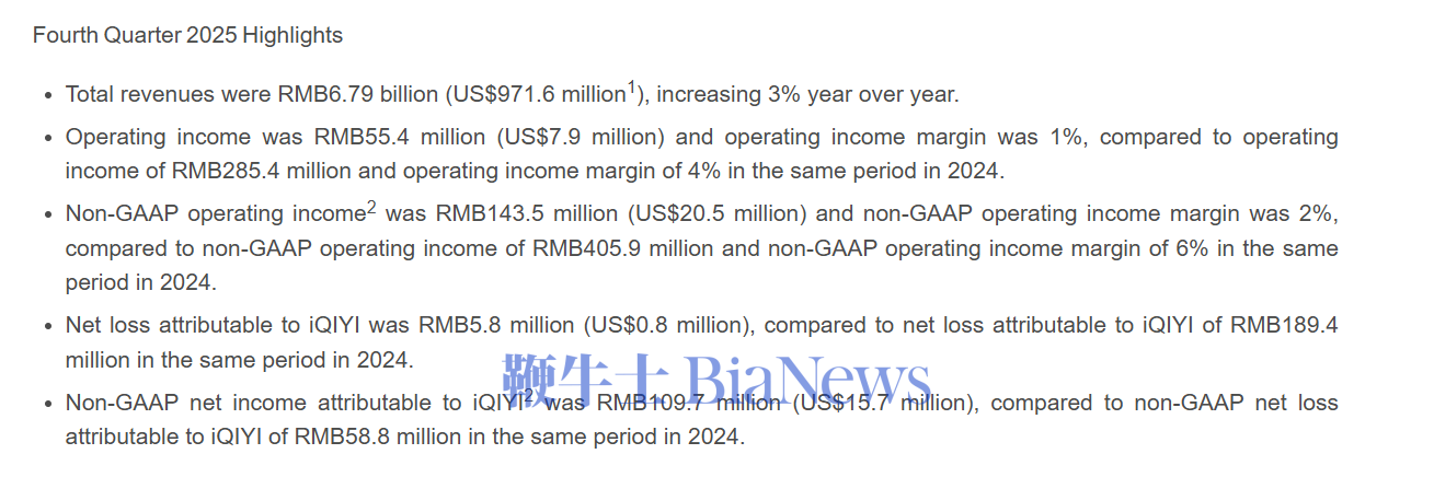 归属于爱奇艺的非GAAP净亏损为1.097亿元人民币,而2024年同期归属于爱奇艺的非GAAP净亏损为5880万元人民币。
