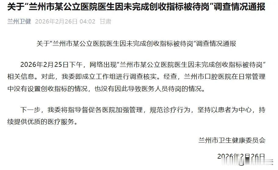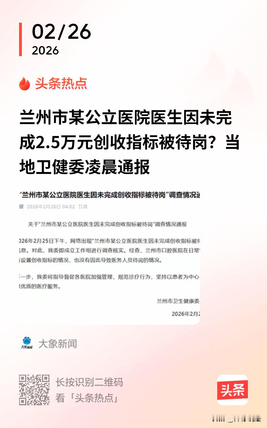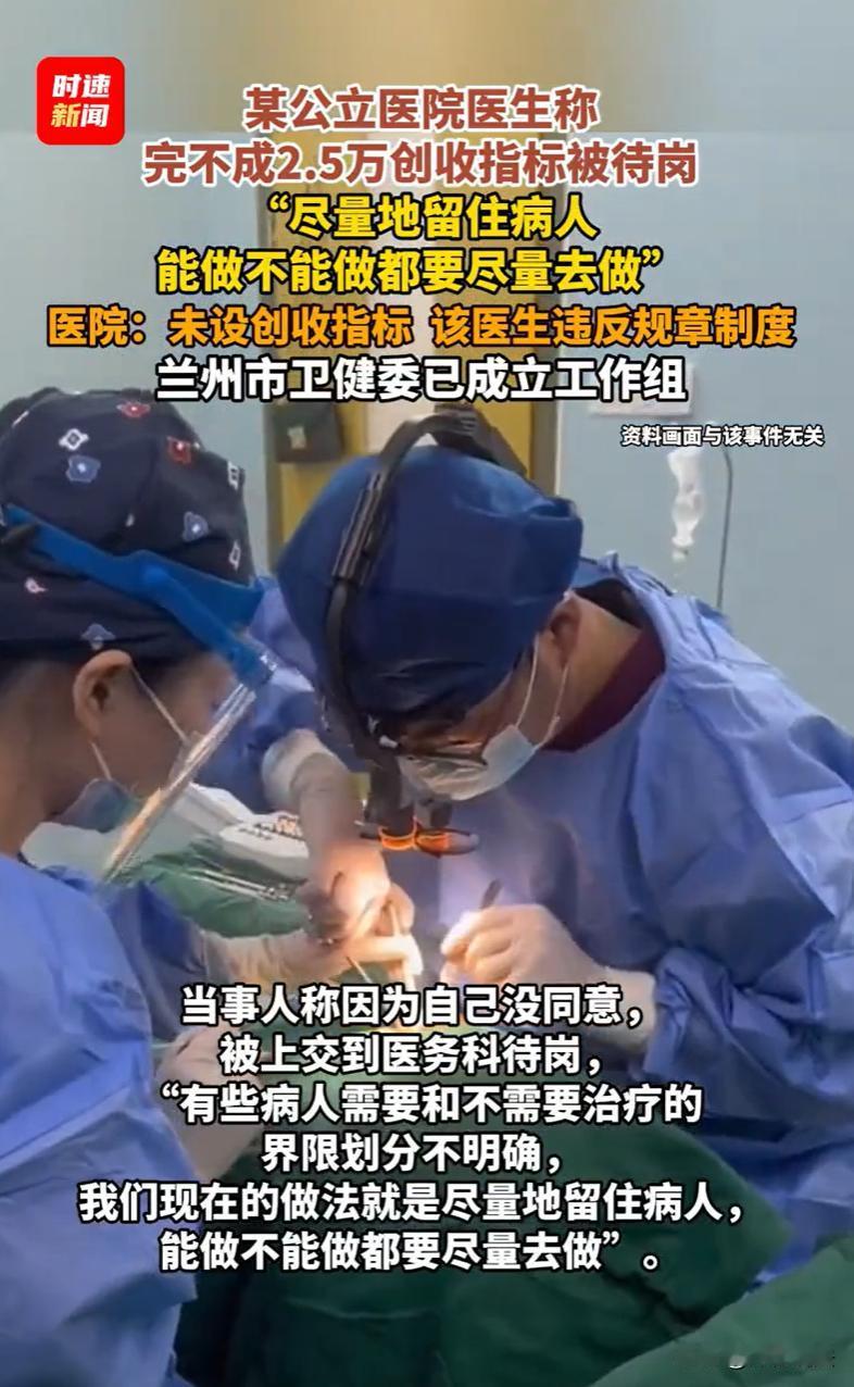 这事儿怪了。兰州一公立医院医生爆料:每月硬扛2.5万“创收指标”,完不成得找同事“借”,再自己掏钱还。他不肯配合,直接被送去“待岗”。医生坦言,为了完成任务,有些可治可不治的病人,只能硬着头皮留。医院却一口否认有创收指标,说待岗是因他违规。卫健委连夜通报:查了,没这事。一边是医生说得有鼻子有眼,一边是官方快速辟谣。到底怎么回事呢?   2026年2月25日,网上突然传出一条消息,说是兰州有一家公立医院的医生,因为没完成医院定的“创收指标”,被弄去“待岗”了。   这消息一出,网上立马就炸了锅。   有网友质疑,医院是救死扶伤的地方,怎么跟公司搞销售似的,还定起指标来了?   有网友心里都犯嘀咕,这以后去看病,医生会不会为了完成指标,本来不该做的检查也给做了,不该开的药也给开了?   爆料的是这家医院的一名医生,他对着媒体镜头,话说得很实在,但也透着一股无奈。   他说,医院给他们每个医生都定了“创收指标”,他每个月是2.5万。   这2.5万怎么理解?大概就是,医生要给医院挣回来这么多钱。要是完不成咋办?他透露了一个听起来挺“魔幻”的操作:找别的医生“借”。   比如你这个月没完成,缺口是五千,你可以先找完成了甚至超额了的同事,把他多出来的指标“借”过来,先把你这月的任务给填平了。   然后呢,医院会从你下个月的工资里把这笔钱扣出来,你再拿这个钱还给那个同事。   这位医生说,他因为没同意这种操作,就被医院上交到了医务科,让他“待岗”了。   他话里还提到一个更核心的问题:“有些病人需要和不需要治疗的界限划分不明确,现在的做法就是尽量地留住病人,能做不能做都要尽量去做。”   这事儿闹大之后,媒体记者马上就联系了这家医院。   医院医务科的工作人员很快给出了回应,但说法跟那位医生完全不同。   工作人员非常明确地说:医院从来没有设置过“创收指标”。   至于那位医生为什么待岗,他们的解释是:因为他违反了医院的规章制度,并且强调,从来没有因为收入没达到某个数而扣医生的工资。   一边是医生言之凿凿,有具体数字,有“借指标”的操作细节;另一边是医院官方否认,说是违纪待岗。   双方各执一词,事情搞得一头雾水。   2月26日,卫健委连夜发布了通报,调查的初步结果是:经查,医院在日常管理中没有设置创收指标的情况,也没有因此导致医务人员待岗的情况。   那么,从法律角度,这件事如何评价呢?   1、涉事医院是否设置了“创收指标”?   本案中,虽然卫健委的通报上暂时给事件定了性,但从法律证据角度看,这件事还不能简单画上句号。   在法律上,需要区分“明文规定的创收任务”和“变相的绩效考核压力”。   如果医院虽然没有下发名为“创收指标”的红头文件,但在内部绩效考核方案中,将医生的工资、奖金、评优等与医生的“开单量”“检查费收入”“药品收入”等经济指标进行“硬挂钩”,这种做法在实质效果上就等同于创收指标。   医生的说法暗示了考核压力确实存在,所以,法律上需要查明的不仅是“创收指标”这四个字存不存在,更要查明医院的绩效考核体系是否实质上构成了与收入挂钩的违规行为。   卫健委通报中的“没有设置”,可能仅指没有直接命名的文件,但绩效考核体系的合规性仍需进一步审视。   2、医生被“待岗”是否合法?   本案中,“待岗”并非《事业单位人事管理条例》中的法定处分种类。   在实践中,待岗通常被视为一种内部管理措施,但实质上是变更了劳动合同的履行内容,暂停了医生的执业权。   结合相关法律规定及实践,合法待岗的前提条件,要求有制度依据、事实依据且程序正当。   一方面,医院必须有合法有效的规章制度明确规定何种情形下可以安排待岗。该制度必须经过民主程序制定,且已向全体医务人员公示。   另一方面,必须有确凿证据证明医生严重违反了上述制度。   此外,在作出待岗决定前,应当给予医生陈述和申辩的机会。   医院虽然声称医生“违反规章制度”,但在法律纠纷中,遵循“谁主张,谁举证”的原则。   如果医院拿不出该医生签字确认的规章制度文本,或者拿不出证据证明医生具体违反了哪一条、造成了何种后果,那么这种“待岗”处理就可能构成违法,侵犯了医生的劳动权。   3、涉事医院可能存在“过度医疗”风险   《基本医疗卫生与健康促进法》第五十四条规定,医疗卫生人员应当……合理诊疗,因病施治,不得对患者实施过度医疗。   《民法典》第一千二百二十七条规定,医疗机构及其医务人员不得违反诊疗规范实施不必要的检查。   如果为了完成经济指标,对患者实施不必要的治疗或检查,一旦被查实,医院及相关人员不仅会面临卫健委的行政处罚,如果造成患者损害,还需承担民事赔偿责任。   对此,您怎么看?@洋仔说法