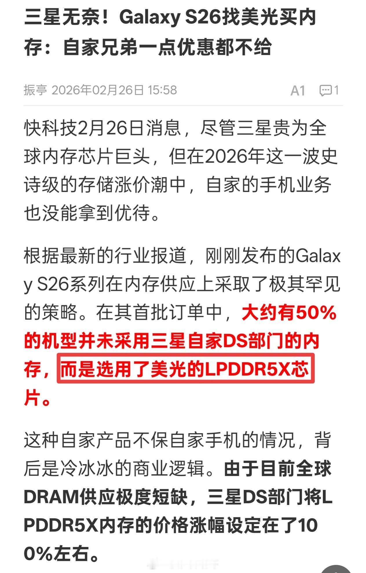 这事挺有意思的,既能自己造手机、又能自己产内存的韩国巨头三星,他们家最新的旗舰机Galaxy S26,居然跑去跟竞争对手美光买内存了......