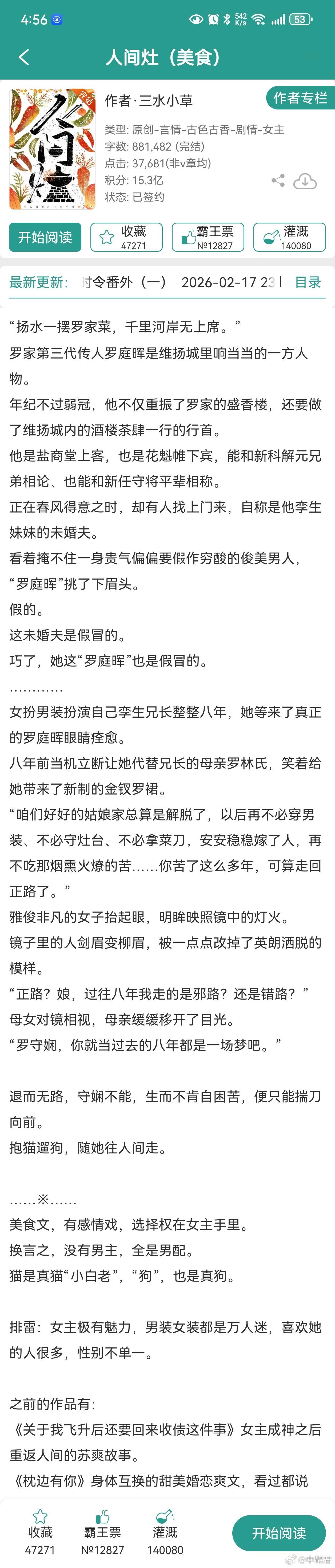 人间灶(美食)这本好看的,但我看到有面有点太累了,太长了,女性成长向,以及权谋的,没有感情线,喜欢的可以去看