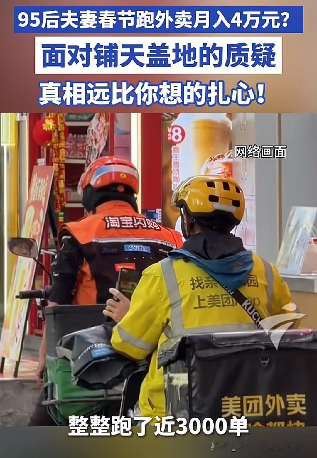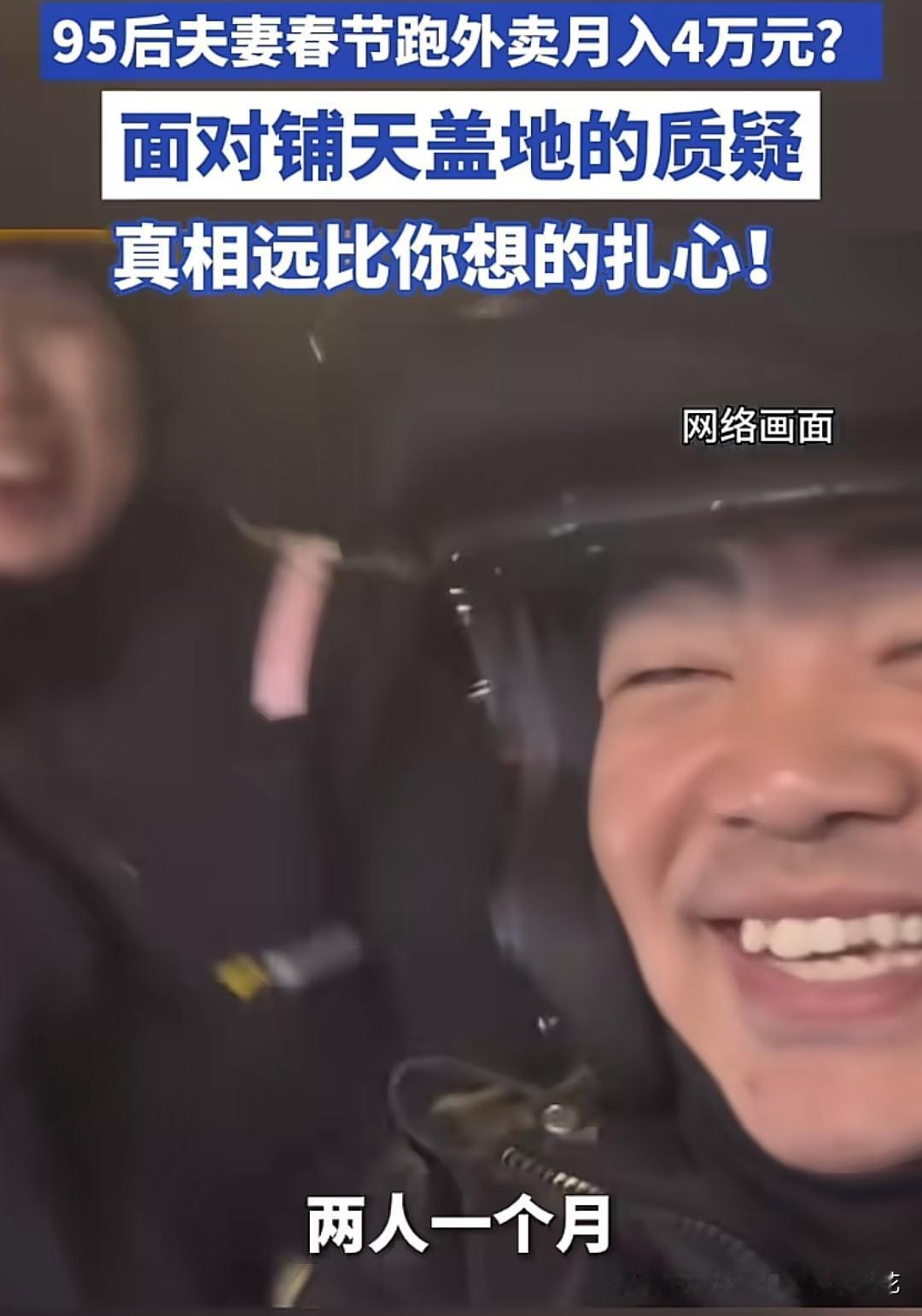 你信吗?我是不信的。河南一对95夫妻春节送外卖月赚4万,这是想传达什么信息呢?是歌颂苦难吗,还是送外卖很有前途,能月入4万? 很多网友是这样算的:春节8天,收入4万,即一天5000,乘365,一年就是182万。其实不对,七天是特殊时期,基本不会免运费,而且每单的单价很高,运费也很高,少的也有五六块,高的十几块几十块,是平时分三四倍,如果附近只有这对夫妻骑手,月入过万不是问题。 但问题就在于,附近有单吗?如何保证有源源不断的订单?月赚4万,基本2分钟一单,人是得不到任何喘息和休息的机会的,再看夫妻的气色,一脸的惬意和愉悦,没有沧桑,也没有疲惫,每天疲惫不堪的普通骑手能有这气色? 尽管平台已硬核作证,这就不得不让人怀疑是剧本,是以身入局的宣传片,让年轻人加入外卖大军,节假日不休息,春节不打烊,实现那所谓的月入过万的“暴富梦”。如果成功了,明年春节没人回家过年了,都忙着送外卖。