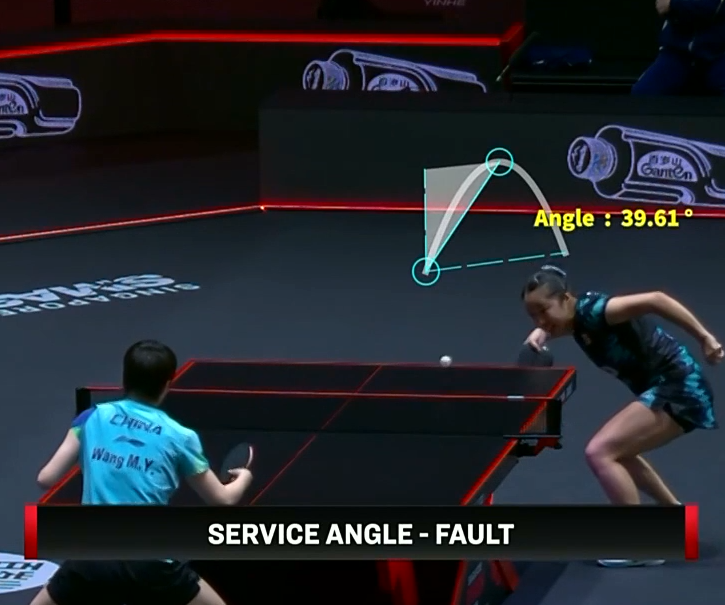 第二局比赛申裕斌被判回抛违例,随后她申请挑战显示39.61°,申裕斌挑战失败。