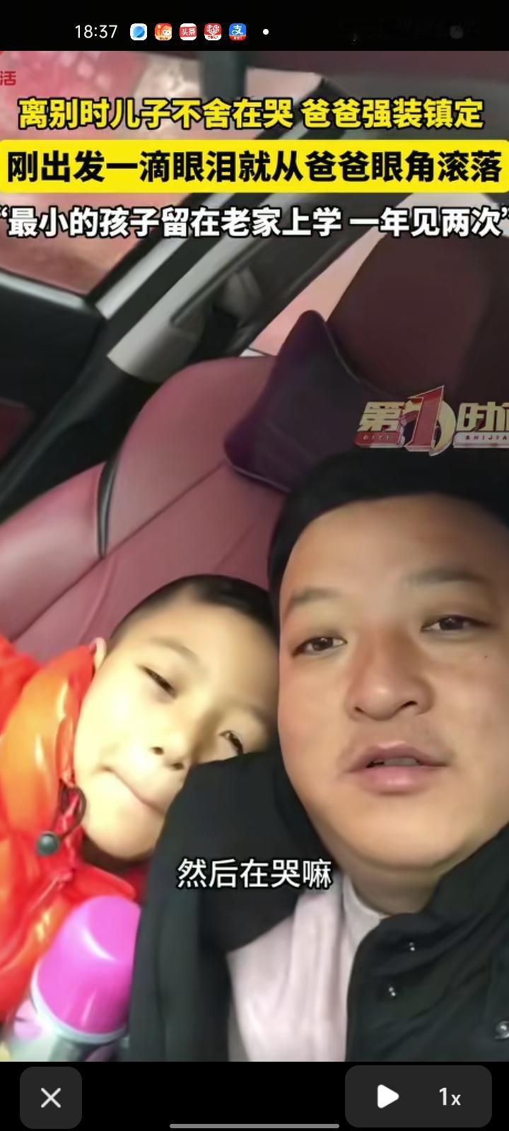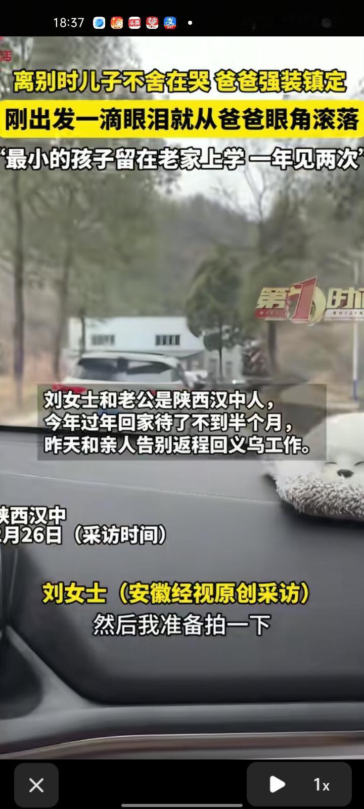 2月25日,汉中市镇巴县。刘女士和老公是陕西汉中人,今年过年回家待了不到半个月,和亲人告别后回义乌工作。她本想拍视频做纪念,结果看到老公的眼泪从眼角滚落。 刘女士称,他们有三个孩子,大的在上大学,还有一个在义乌上学,只有最小的儿子,因为不好转学插班所以留在老家。出发时,孩子不舍得他爸就哭了,他爸走的时候强装镇定还在笑着。