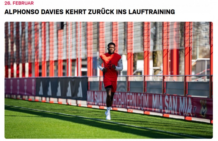 直播吧2月26日讯拜仁官网发文,确认边后卫阿方索·戴维斯恢复跑步训练。
