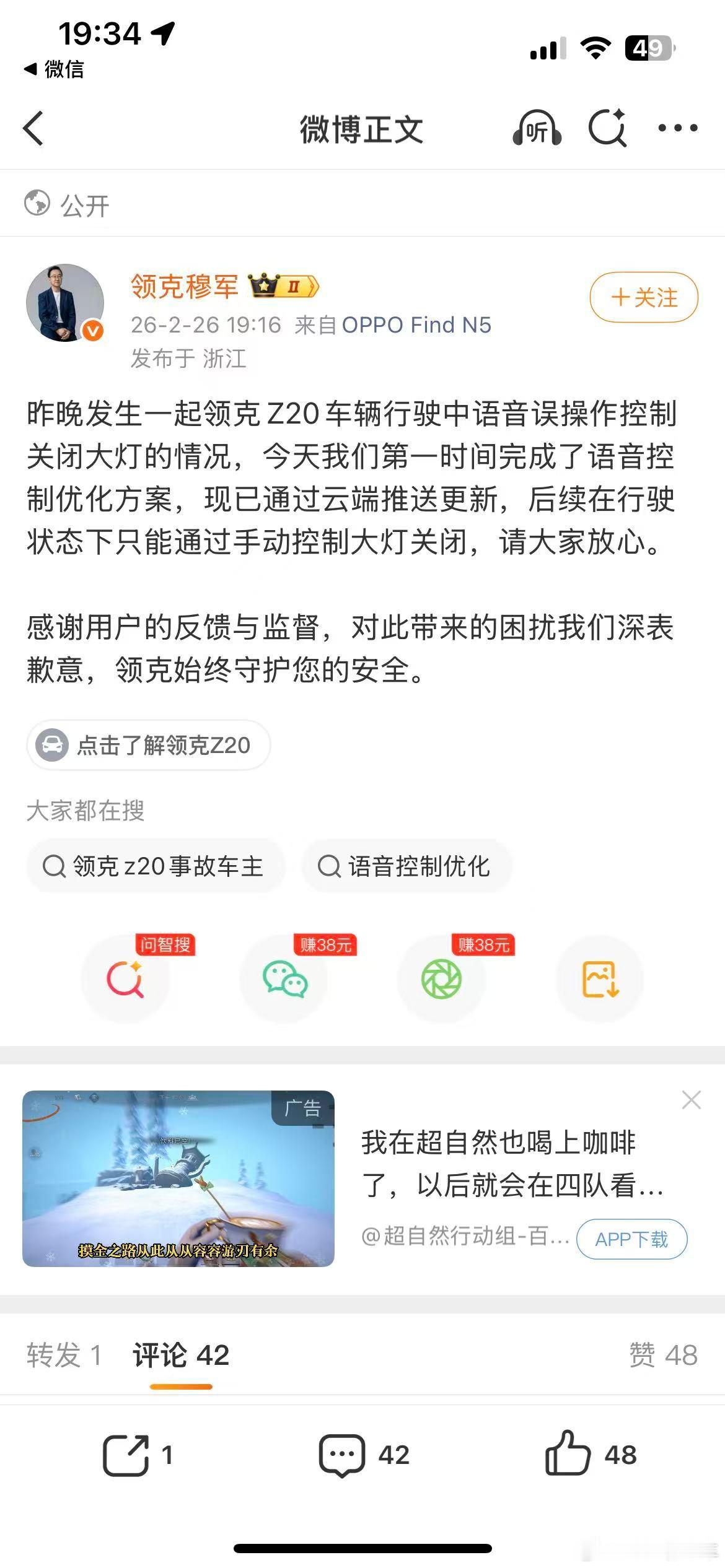 网上流传的领克Z20语音关闭车灯事件领克反应速度很快,官方下场道歉的同时马上紧急修复ota,杜绝再次出现安全隐患