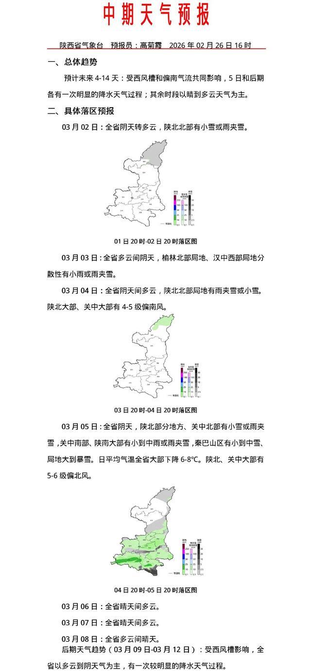 3月1日:城区及平原地区小到中雨或雨夹雪转阴天,南部山区有中到大雪,局地有暴雪,3℃~6℃;