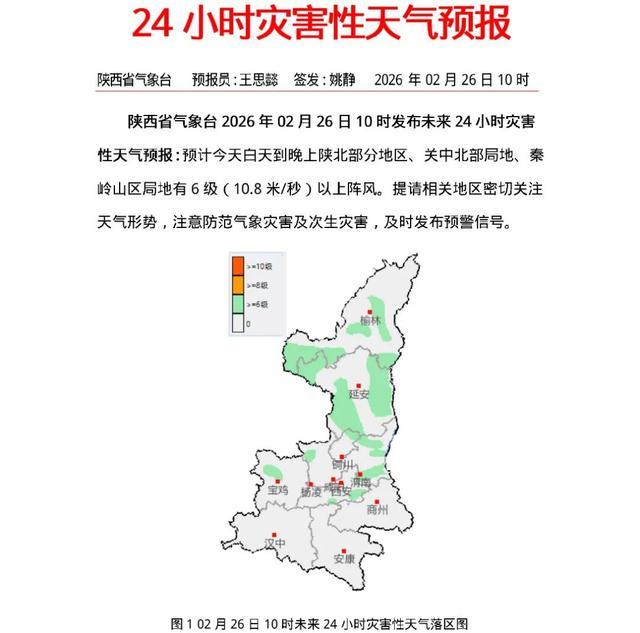 预计今天白天到晚上陕北部分地区、关中北部局地、秦岭山区局地有6级(10.8米/秒)以上阵风。提请相关地区密切关注天气形势,注意防范气象灾害及次生灾害,及时发布预警信号。