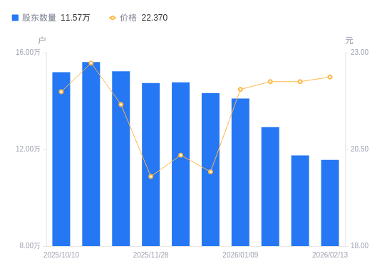近一年(2025年2月20日至2026年2月13日),有研新材A股股东户数从16.29万户,减低至11.57万户,降幅28.98%,区间股价上涨22.30%。