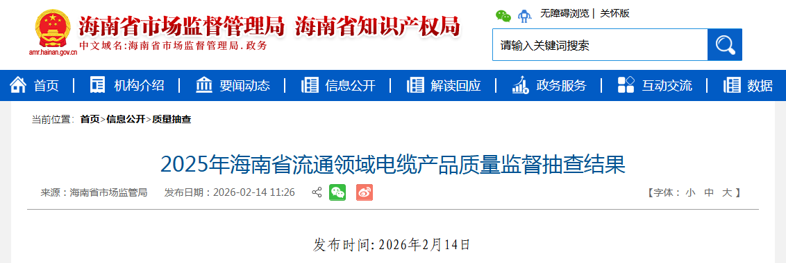 中国质量新闻网讯据海南省市场监督管理局网站消息,2025年第4季度,海南省市场监督管理局对全省流通领域电缆产品进行了监督抽查。本次抽查了13批次产品,经检验,不合格1批次。