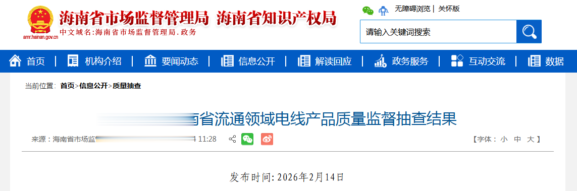 中国质量新闻网讯据海南省市场监督管理局网站消息,2025年第4季度,海南省市场监督管理局对全省流通领域电线产品进行了监督抽查。本次抽查了27批次产品,经检验,不合格1批次。