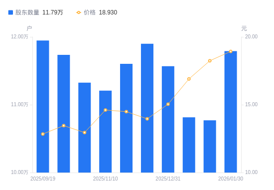 日期A股户数(户)流通A股户均持股数(股)户均持股市值(万元)2026-01-201077098487.7815.482026-01-091081368454.2614.292025-12-311156797902.9911.892025-12-101189847683.4710.732025-11-281160387878.5411.422025-11-101120868156.3311.922025-10-201132518072.4210.452025-09-301173587789.9310.492025-09-191194667652.479.832025-09-101192297667.6810.19