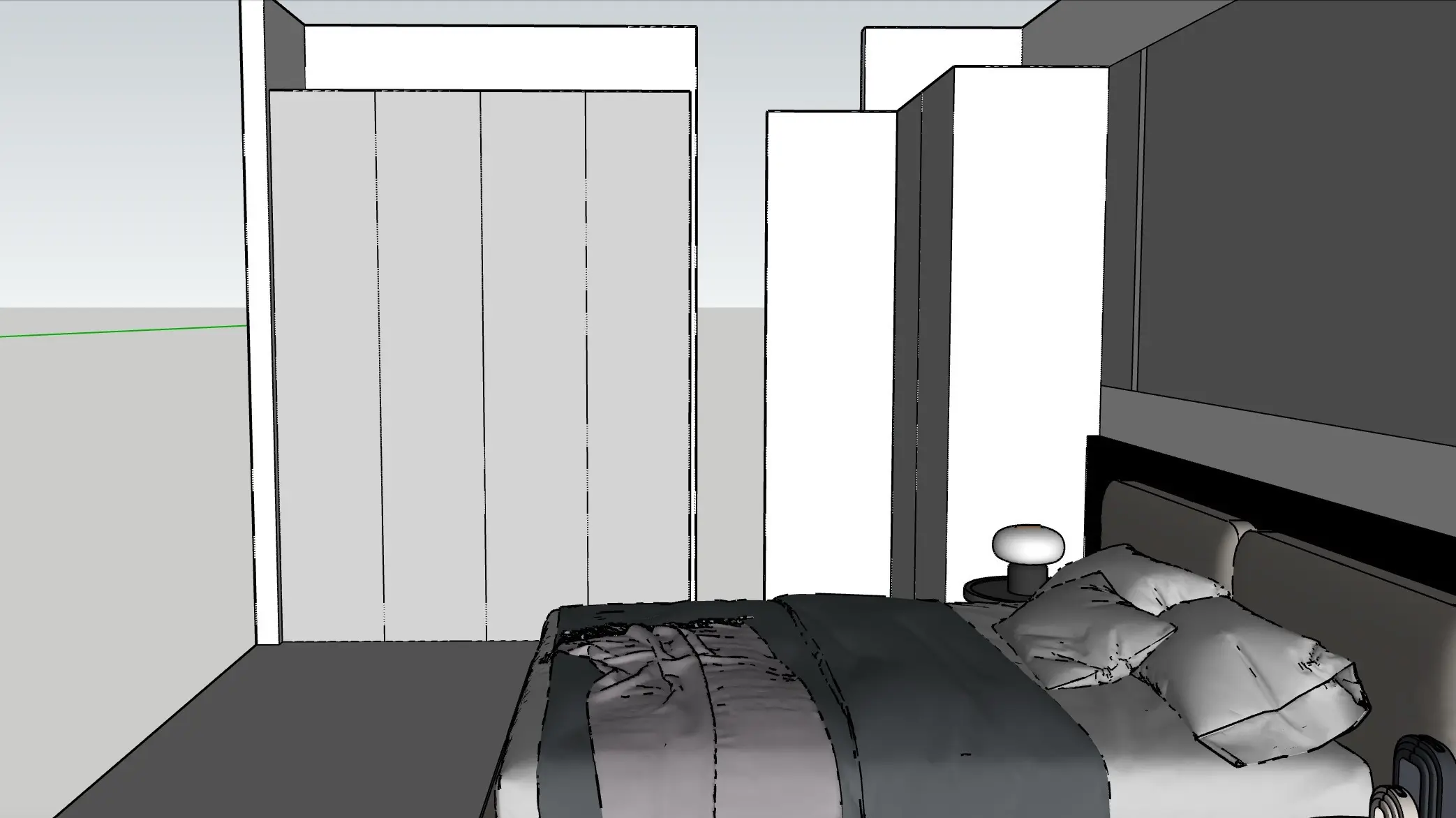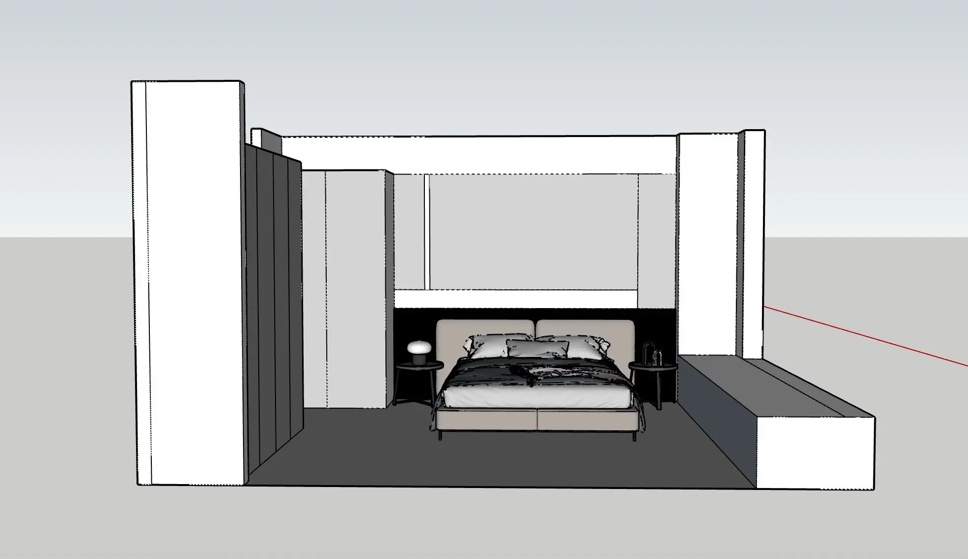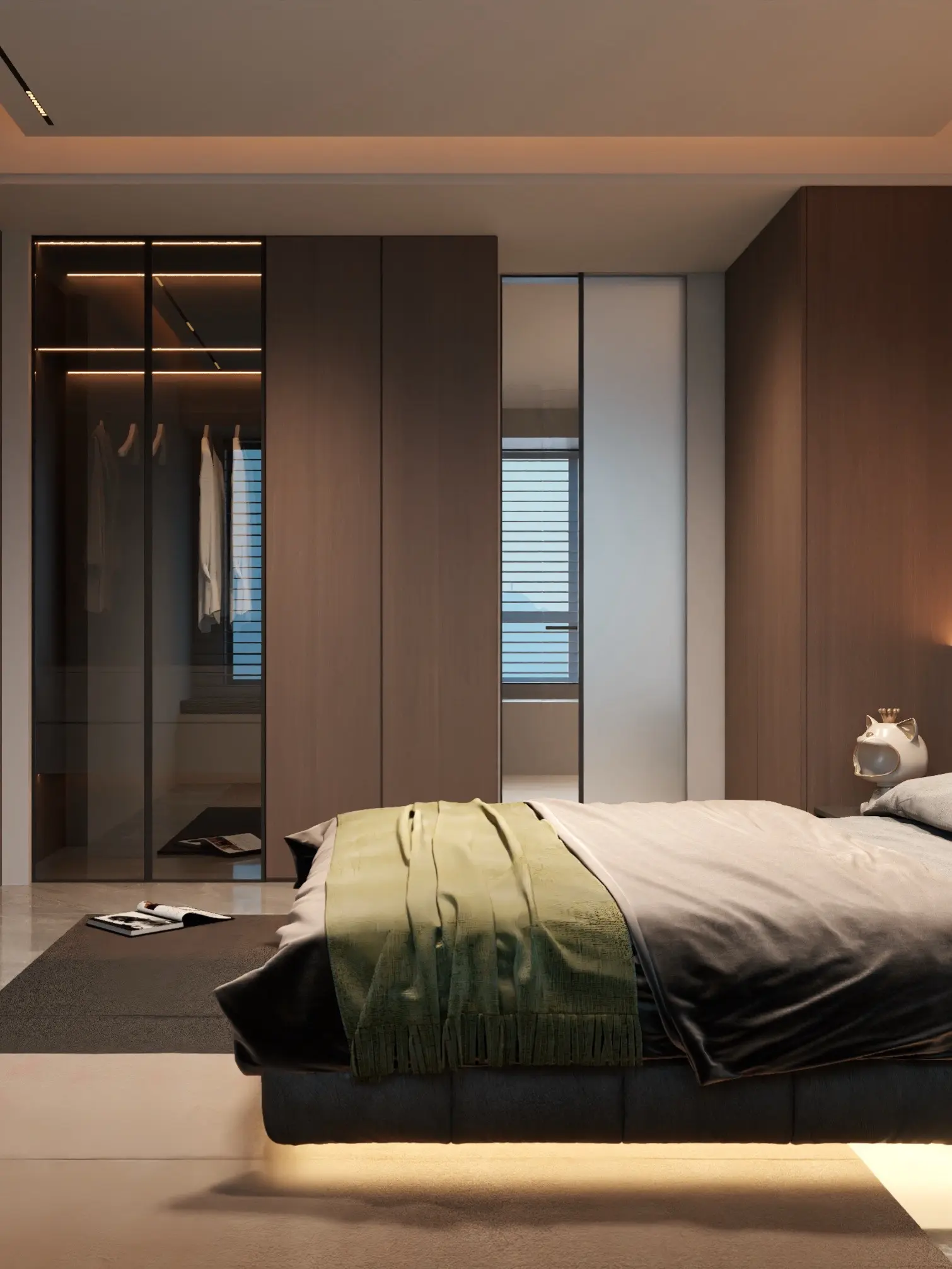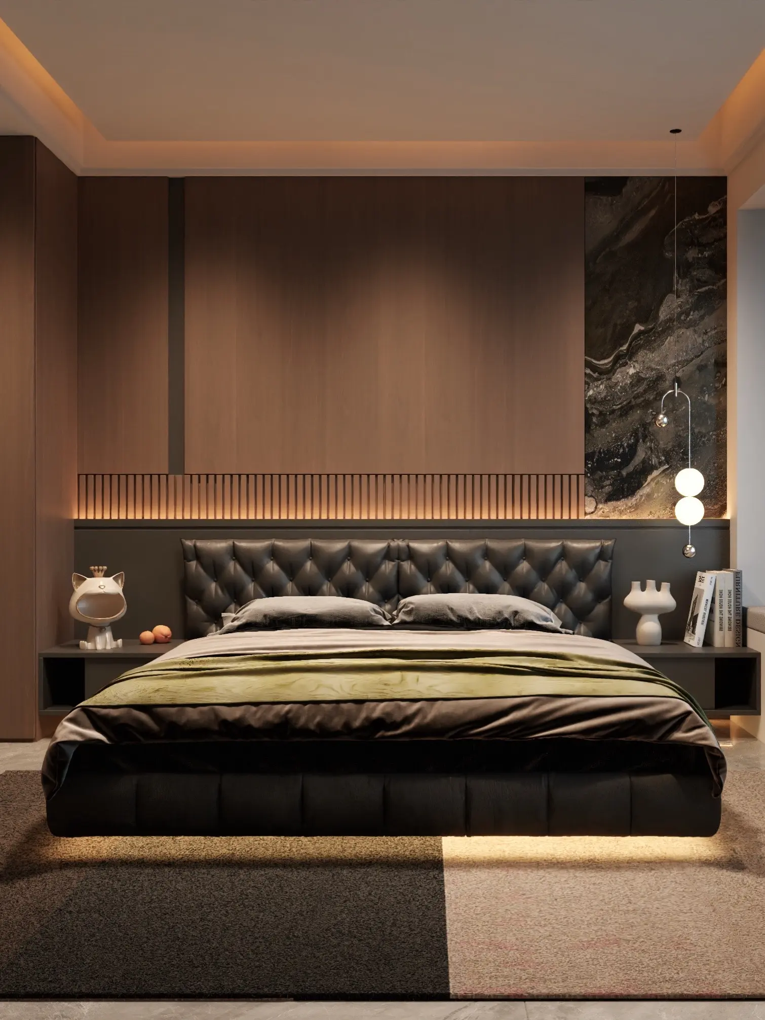 • 𝑳𝒀 𝑫𝑬𝑺𝑰𝑮𝑵 意式风设计分析 🏠空间布局与尺寸 .房间尺寸为 5099mm x3800mm,呈长方形,布局不紧凑合理(床卫生间门问题业主没要求) ·床居中放置,两侧对称设置床头柜与吊灯,背景墙采用整面墙板+局部岩板拼接,视觉上延伸空间感。 ·左侧为通顶衣柜,右侧为窗边飘窗台,兼具储物与休闲功能。 设计风格与材质 .主色调:深棕木色+黑色 营造沉稳高级感。 .床具:黑色皮质软包床头+悬浮床体,搭配精致床品,点缀亮色。 .背景墙:左侧木饰面+右侧深色岩板,形成材质对比,提升层次。 .灯光设计:吊顶嵌入式灯带+床头吊灯+床底灯带,打造温馨氛围光。 功能细节 ·飘窗设计为坐台,可作休闲或阅读区,搭配百叶窗调节光线。 ·地面铺设浅色地砖,搭配深色地毯,划分功能区域。 这样的设计你喜欢么?主卧设计方案