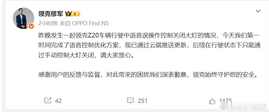 那个语音误关大灯的问题我也觉得很不应该不过,领克的态度就是直接面对,直接承认,火