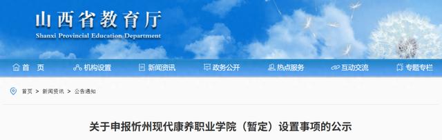 根据《中华人民共和国高等教育法》《高等职业学校设置标准(暂行)》等有关规定,经省高校设置专家组考察,并经省教育厅研究,拟申报设置忻州现代康养职业学院(暂定),现向社会予以公示。
