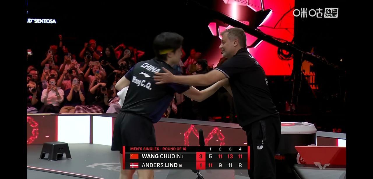 新加坡大满贯男单1/8决赛, 第三局丹麦的林德7:1领先被王楚钦逆转13:11拿下。 也怪这个林德太小心了, 领先那么多王楚钦追了一分他就绷不住要了暂停, 看得出来他紧张了。 第三局输掉后坐在裁判身边哭, 还好他哭了, 谢谢王楚钦, 不然哭的就是球迷们。 王楚钦在拿下第三局后, 回头朝着观众席紧握拳头, 这一局拿下基本锁定了胜局。