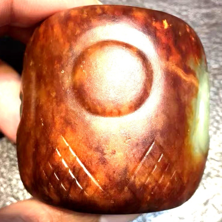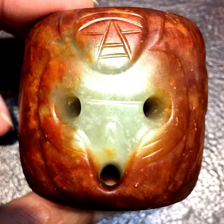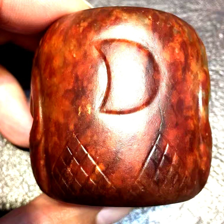 高古玉 极少见的红山玉器,一只红山鼓型板指,正反两面,一男一女,以底部,生殖器官表示。左右测,一太阳一月亮,下部有三角形的网络纹,刀工干净利落,怎么看都觉得特别舒服。