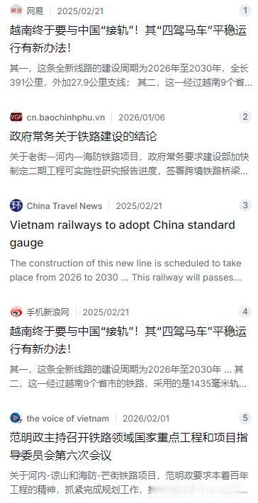 越南突然向中国提出要借钱修铁路?这可不是小数目,整整83亿美元!更有意思的是,这条铁路还要采用和中国一样的1435毫米轨距。要知道,越南可是一直在用米轨的“倔强少年“。这是怎么回事? 2026年2月的东南亚边境,不再只有刺耳的旧式金属摩擦声。随着大型机械进场,全长约390公里的老街—河内—海防铁路进入了关键的动工阶段。这一刻,越南延续了一百多年的“米轨”时代,终于在推土机的轰鸣中开始谢幕。 如果你此刻站在中越边境,会发现那些宽度仅为一米的法国殖民时代遗迹,正被1435毫米的国际标准轨距所取代。这5厘米左右的宽度跳跃,越南走了整整一个世纪,也为此在过去十三年里付出了沉重的代价。 故事的转折点其实藏在那些看似冰冷的数字里。今年,越南政府为了筹措这笔约83亿美元的庞大建设经费,对自己下了一道近乎自残的公文:要求各职能部门通过削减5%的日常行政开支来“抠”出修路钱。 这种近乎孤注一掷的紧迫感,源于一场长达十余年的战略误判。早在2010年,越南曾将振兴铁路的筹码全数押在“日本方案”上。然而,那部名为“日系技术”的高铁连续剧,却因预算超标、国会否决和工期无限期后撤,演变成了颗粒无收的空转。 就在越南守着那些悬而未决的图纸陷入泥潭时,邻居老挝的处境彻底刺激了河内的神经。2021年12月通车的中老铁路,用一年激增35%贸易额的硬数据,在泛亚铁路的版图上生动演示了什么叫“路通财通”。昆明到万象只需10小时的奇迹,像是一记重锤,砸碎了越南最后一点对米轨的执着。 2024年初,越南国会正式批准了“老街—河内—海防”线路。此决定为该线路的推进亮起“绿灯”,有望为区域发展带来新契机。2025年8月,总理范明政亲自带队,在富寿省的规划路线上来回审视。他当时撂下的不仅是决心,更是对“中国标准”的全面靠拢。 越南民众历经思索,终于厘清了一笔账目。这一核算过程或许漫长且复杂,但结果已然明晰,其中蕴含的考量想必也颇为深远。以往,中国的货列开到边境,面对窄了一圈的铁轨只能被迫止步。友谊关前,工人们忙着卸货、重装、换轮子,白白耗费的时间成本就是制造业流出的血。 现在,这种人为的“血栓”正被铲除。采用1435毫米标准轨后,越南北部工业园区可与中国昆明实现直接连通。此举将极大促进双方的经济交流与区域合作,为两地发展注入新活力。这意味着,未来数年内,从中国腹地运出的原材料可以直接卸在越南工厂的流水线上,而从海防港出发的成品也能一气呵成地冲进全球市场。 不仅如此,河内已经在紧锣密鼓地筹划另外两条大动脉:连接谅山和芒街。这些支线一旦并网,将把越南北部彻底锁进一个由中国主导的供应链网络。 这场83亿美元的融资博弈,本质上是一场风险与收益的重新定价。越南放下了曾经对标准主导权的微妙警惕,选择通过借贷与技术引进,换取一张通往区域一体化的入场券。 到2030年,当这一条条铁轨连成闭环,中南半岛的经济地理格局将被彻底重塑。从当下的2026年回望,那场历时百年的“倔强”已经成了泛黄的故纸,取而代之的是正在轨道上加速狂奔的现实利益。 消息来源:越南《人民军队》报8月9日讯——越总理范明政考察老街—河内—海防铁路(富寿省段)规划线路