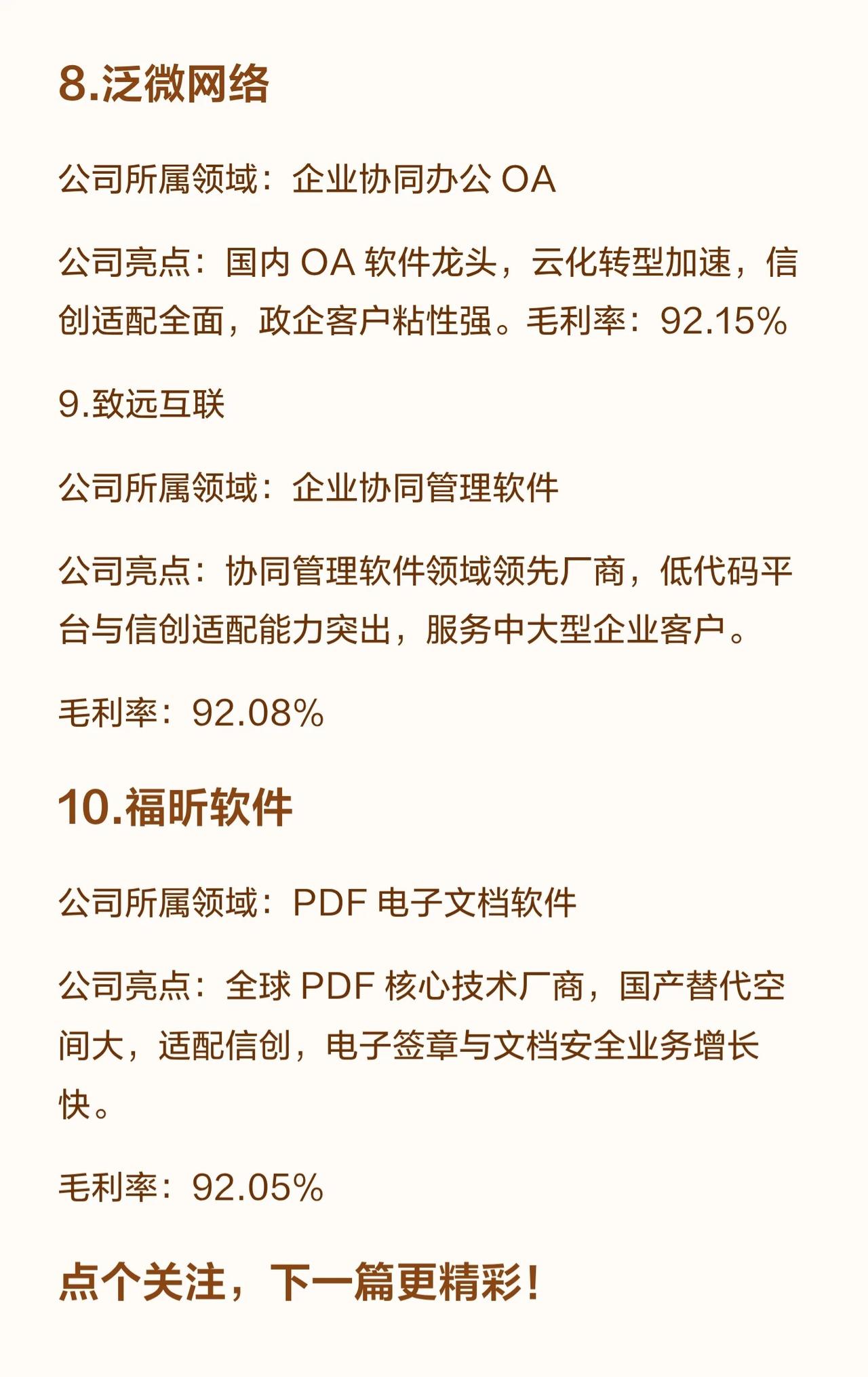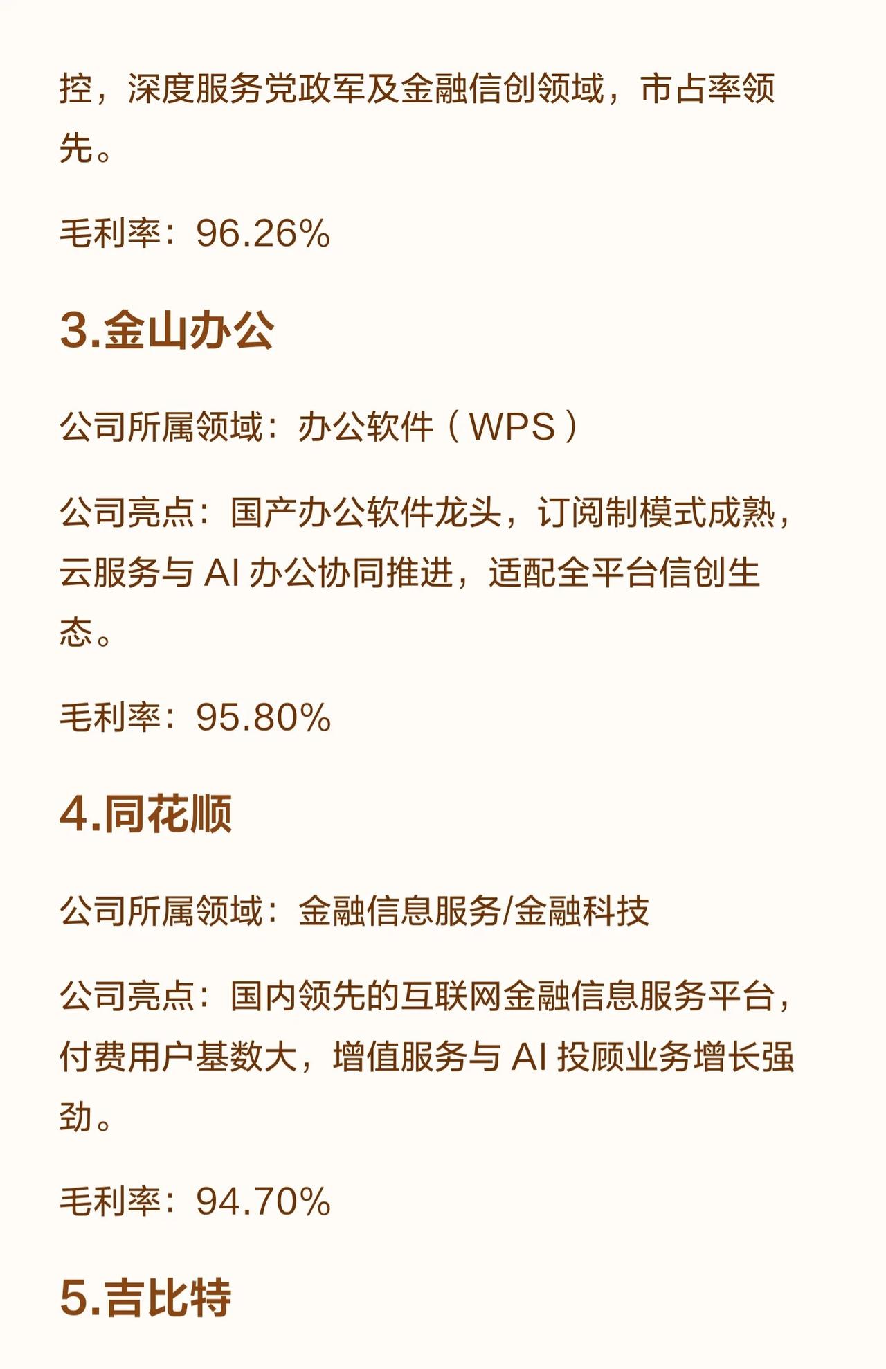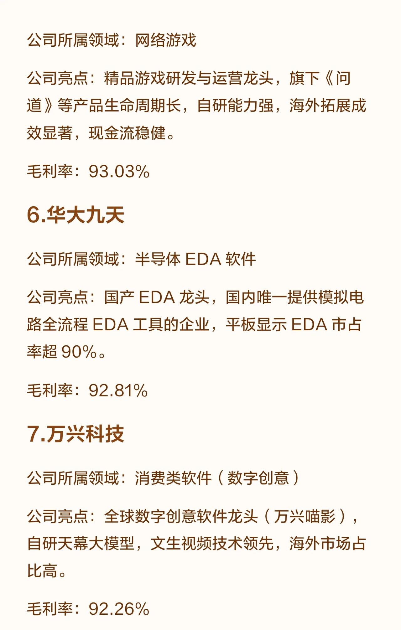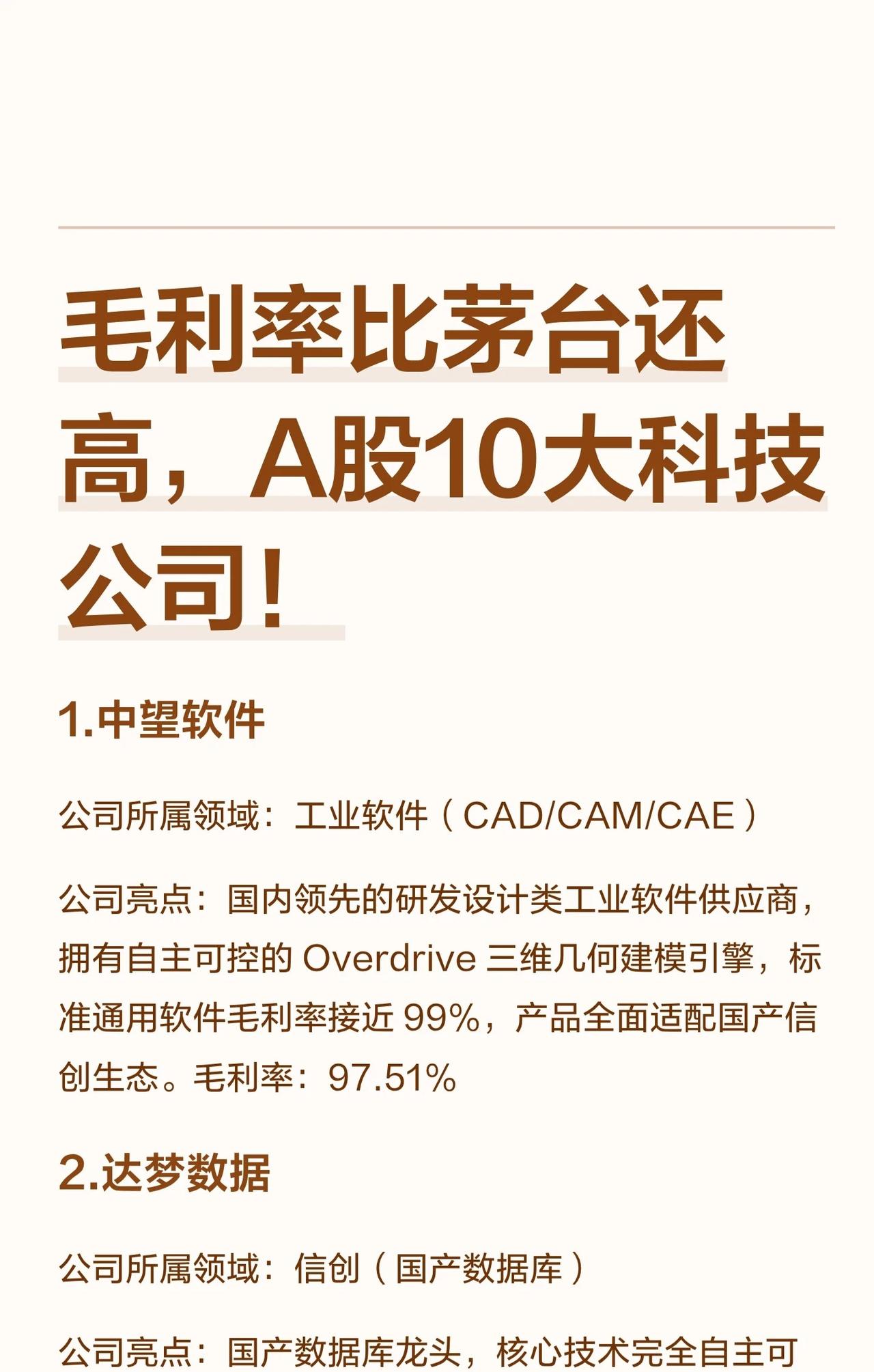 A股10大高毛利科技公司的核心信息总结(按序号排列): 1. 中望软件 - 领域:工业软件(CAD/CAM/CAE) - 亮点:国内领先研发设计类工业软件供应商,拥有自主可控Overdrive三维几何建模引擎,标准通用软件毛利率近99%,产品适配国产信创生态。 - 毛利率:97.51% 2. 达梦数据 - 领域:信创(国产数据库) - 亮点:国产数据库龙头,核心技术完全自主可控,深度服务党政军及金融信创领域,市占率先。 - 毛利率:96.26% 3. 金山办公 - 领域:办公软件(WPS) - 亮点:国产办公软件龙头,订阅制模式成熟,云服务与AI办公协同推进,适配全平台信创生态。 - 毛利率:95.80% 4. 同花顺 - 领域:金融信息服务/金融科技 - 亮点:国内领先互联网金融信息服务平台,付费用户基数大,增值服务与AI投顾业务增长强劲。 - 毛利率:94.70% 5. 吉比特(注:第3张图未完整显示,但按序号补充) - 领域:网络游戏 - 亮点:精品游戏研发与运营龙头,旗下《问道》等产品生命周期长,自研能力强,海外拓展成效显著,现金流稳健。 - 毛利率:93.03% 6. 华大九天 - 领域:半导体EDA软件 - 亮点:国产EDA龙头,国内唯一提供模拟电路全流程EDA工具的企业,平板显示EDA市占率超90%。 - 毛利率:92.81% 7. 万兴科技 - 领域:消费类软件(数字创意) - 亮点:全球数字创意软件龙头(万兴喵影),自研天幕大模型,文生视频技术领先,海外市场占比高。 - 毛利率:92.26% 8. 泛微网络 - 领域:企业协同办公OA - 亮点:国内OA软件龙头,云化转型加速,信创适配全面,政企客户粘性强。 - 毛利率:92.15% 9. 致远互联 - 领域:企业协同管理软件 - 亮点:协同管理软件领域领先厂商,低代码平台与信创适配能力突出,服务中大型企业客户。 - 毛利率:92.08% 10. 福昕软件 - 领域:PDF电子文档软件 - 亮点:全球PDF核心技术厂商,国产替代空间大,适配信创,电子签章与文档安全业务增长快。 - 毛利率:92.05% 共性特征:均为细分领域龙头,核心技术自主可控,深度适配国产信创生态,毛利率显著高于茅台(约91%)