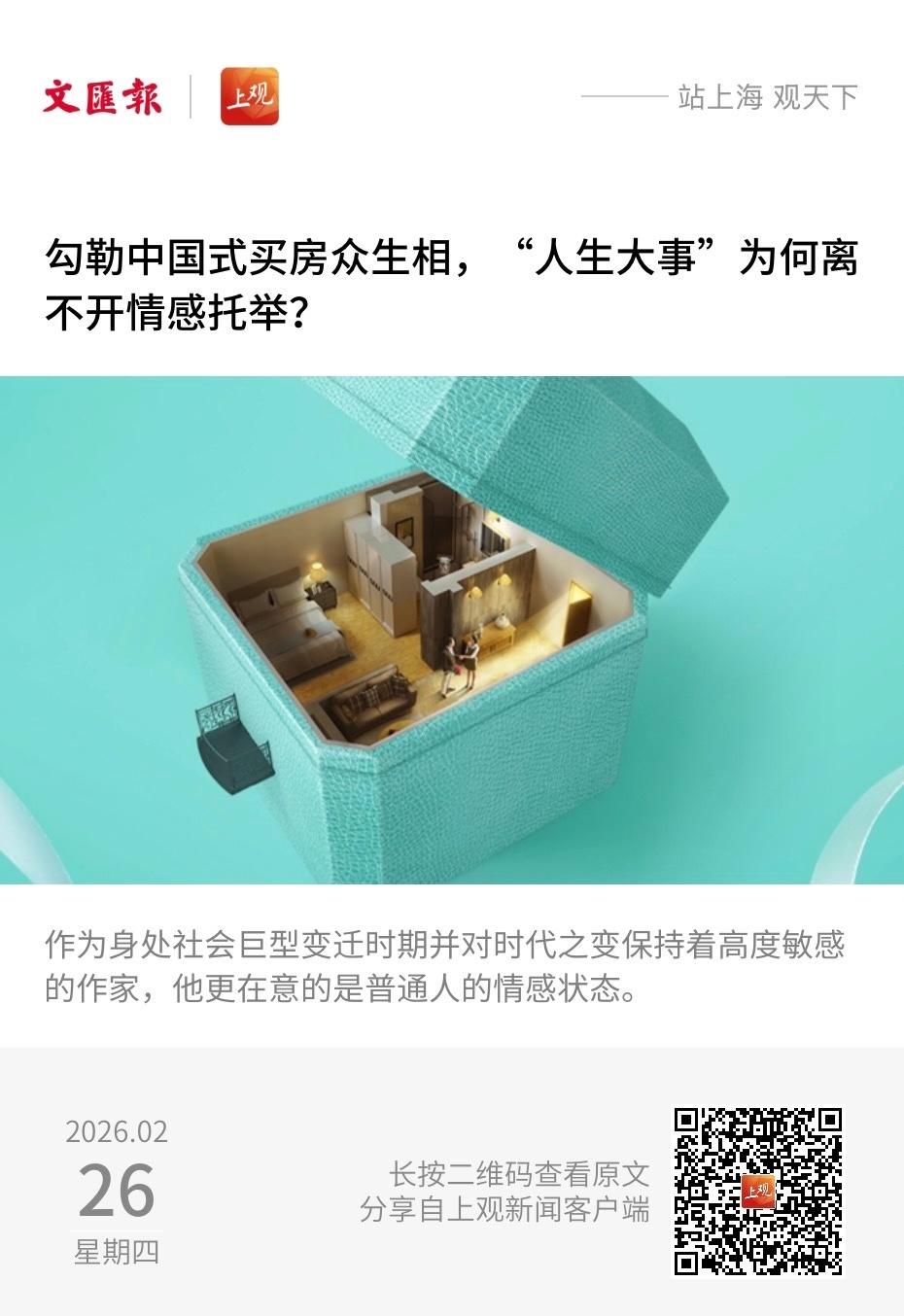 【勾勒中国式买房众生相,“人生大事”为何离不开情感托举?】 (文汇报·新批评 2026-02-26 15:41 )