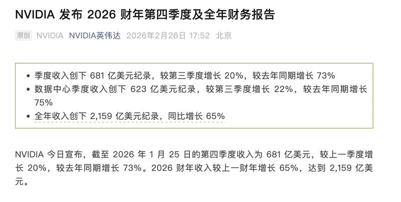 易车讯NVIDIA(英伟达)今日宣布,截至2026年1月25日的第四季度收入为681亿美元,较上一季度增长20%,较去年同期增长73%。2026财年收入较上一财年增长65%,达到2159亿美元。得益于NVIDIA辅助驾驶平台的持续应用,第四季度汽车收入为6.04亿美元,较上一季度增长2%,较去年同期增长6%。全年收入增长39%,达到创纪录的23亿美元。