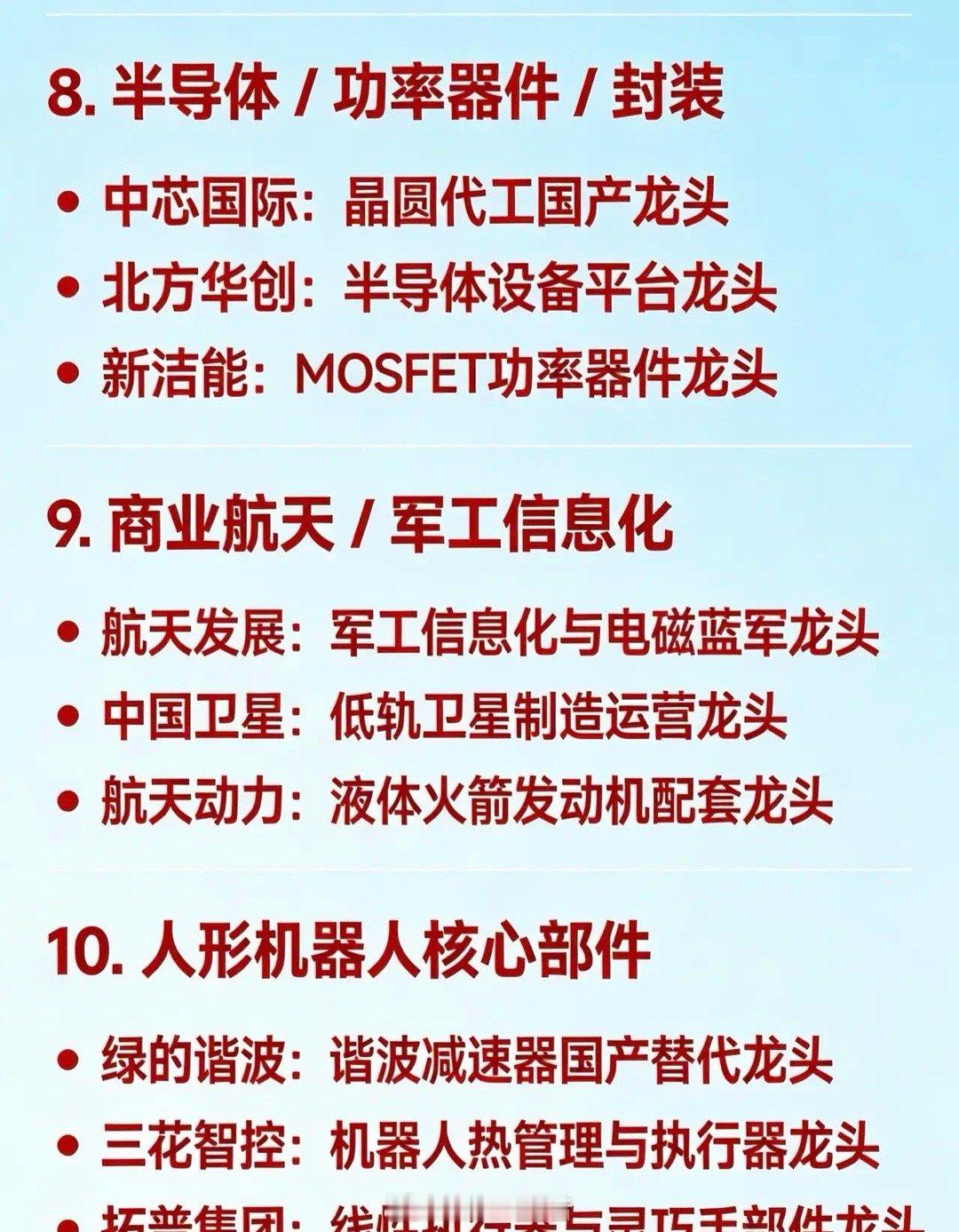 8. 半导体/功率器件/封装:中芯国际是晶圆代工国产龙头;北方华创为半导体设备平台龙头;新洁能是MOSFET功率器件龙头。