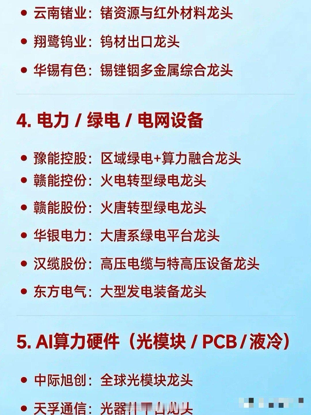 4. 电力/绿电/电网设备:豫能控股是区域绿电+算力融合龙头;赣能股份为火电转型绿电龙头;华银电力是大唐系绿电平台龙头;汉缆股份是高压电缆与特高压设备龙头;东方电气为大型发电装备龙头。