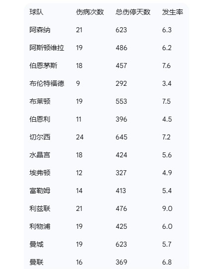 在伤病总次数方面,切尔西与热刺情况最为严重,两支球队均出现了24次伤病。虽然次数相同,但热刺球员累计缺阵时间更长,达到713天,而切尔西为645天。值得注意的是,纽卡斯尔虽仅有21次伤病,其球员总伤停天数却高达722天,位居全联盟之首,这表明该队遭遇的多是长期伤病。