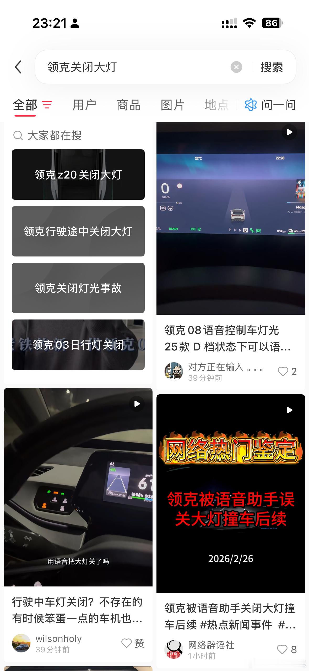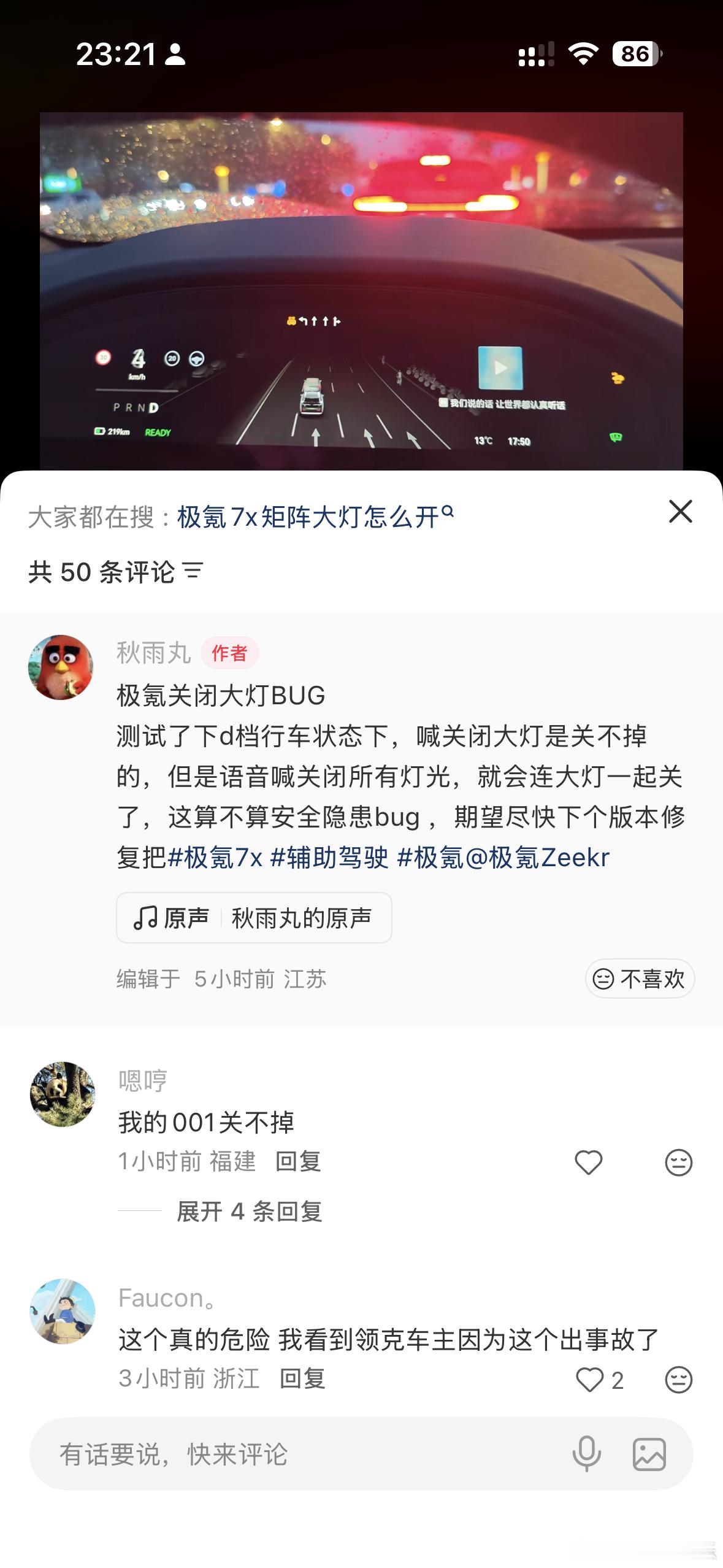 小红书的车友都在实验,看来是这个事故大家都发现bug了。领克和极氪,在正常说“关闭大灯”时,行车情况下,是不会关大灯的,这个逻辑没有问题。 但是一旦说“关闭所有灯”,就会把大灯一起关掉。