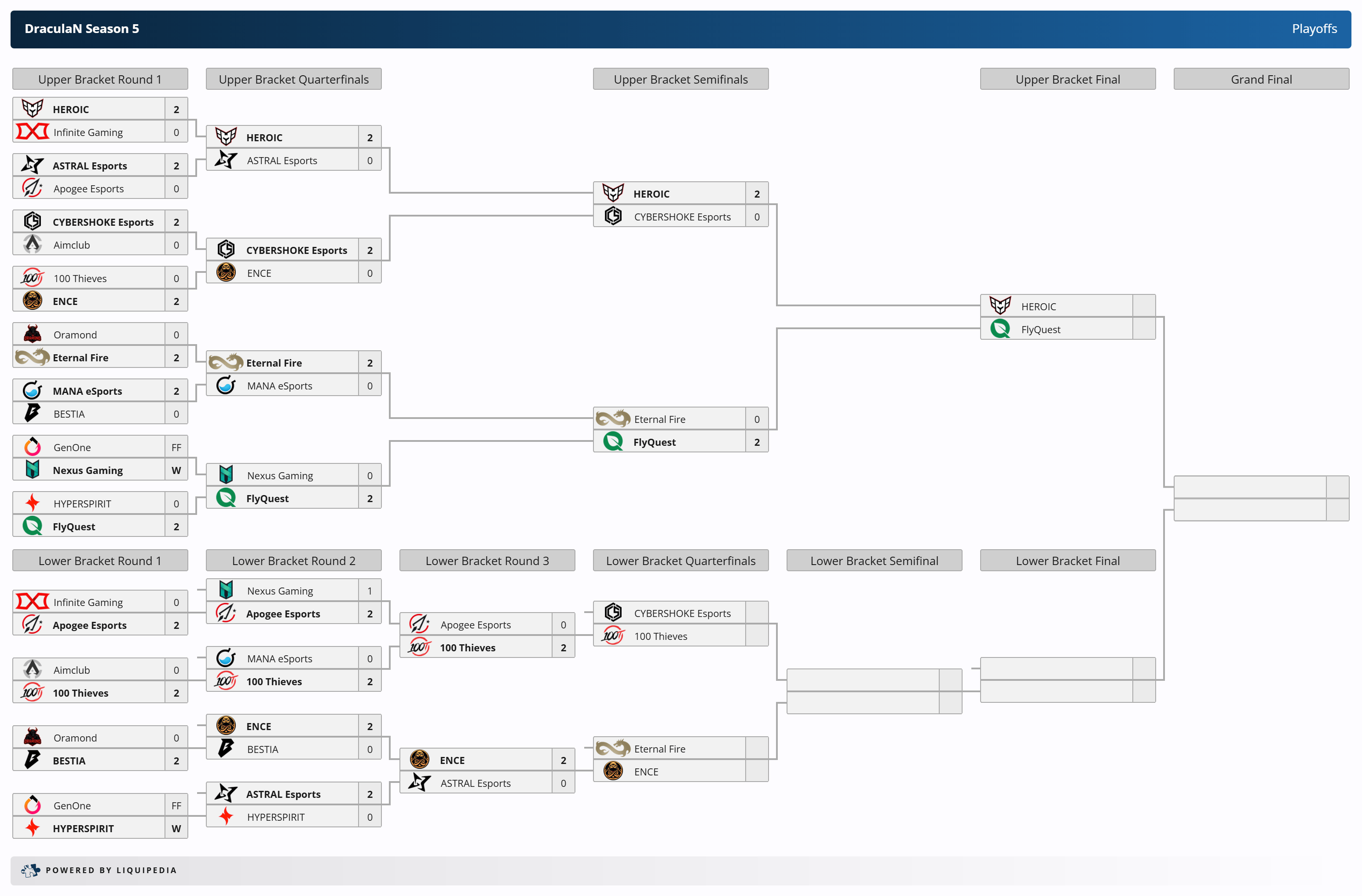 虎扑02月27日讯DraculaNS5双败淘汰赛半程汇总:FlyQuest与HEROIC作为参赛队伍中排名最高的两支队伍,不负众望地以三连胜成功会师胜者组决赛,并且两队在晋级过程当中都一图未丢,Vexite与susp状态火热。
