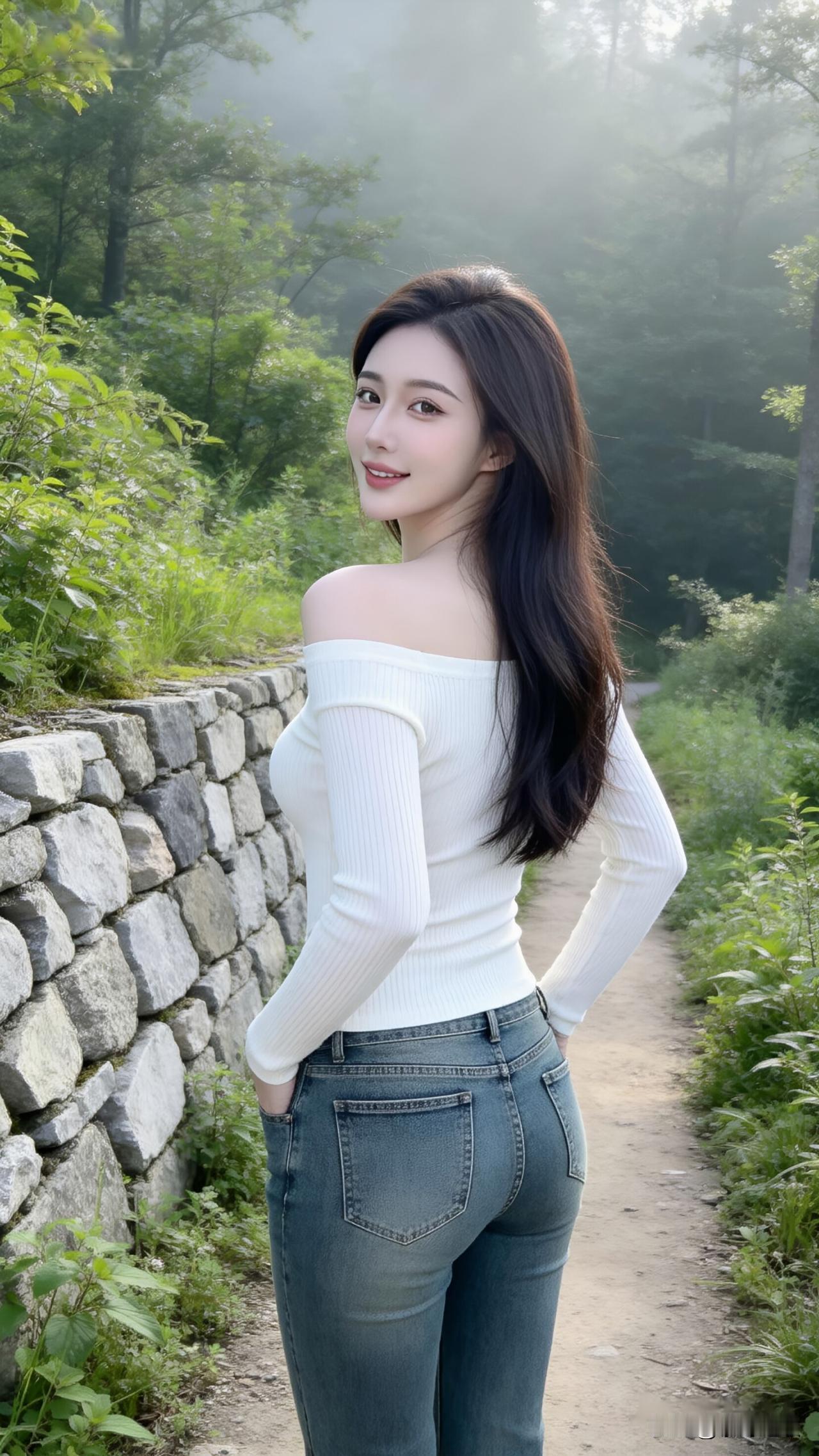 灰色麻花开衫裹着肩,卡其色牛仔裤贴着腿,玉镯在腕间泛着温润的光。站在蓝天下,看着绿叶在身后晃动,忽然觉得自然的美,从来都不需要修饰。开衫的纹理像时光的纹路,手插在裤兜里的瞬间,连风都带着松弛的温度。