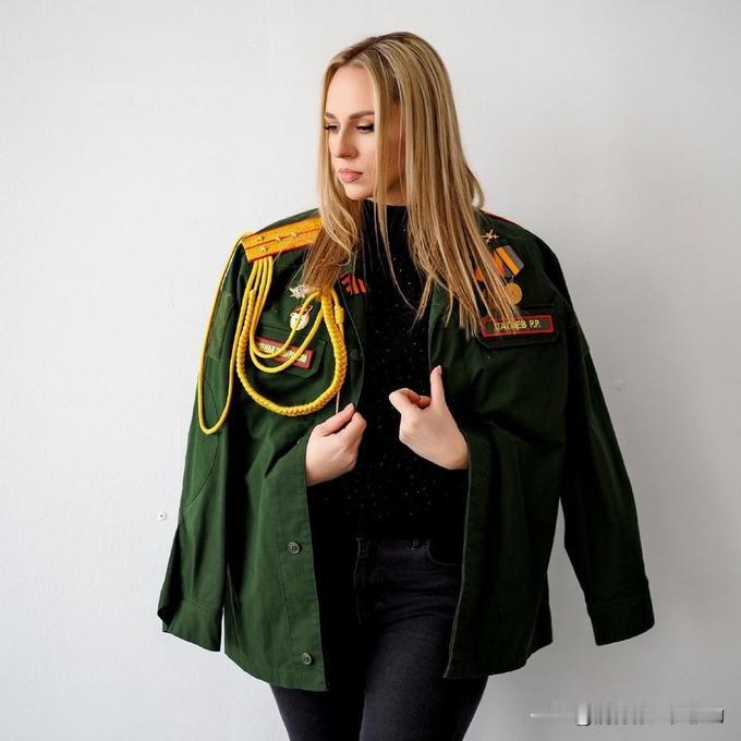 为了鼓舞士气,俄罗斯摄影协会发起“英雄妻子”的活动,为俄军军官妻子摄影,让她们穿上丈夫的衣服,主题是“每个战士背后都站着一个坚强的俄罗斯女人!”图中这位女性在照完像后不久就收到消息,丈夫塔加耶夫上尉在乌克兰被“去军事化”。