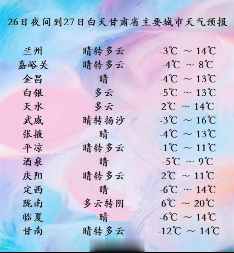 2月27日白天:酒泉、甘南、陇南、天水等市州多云转阴,局部小雨(雪)或雨夹雪;其余地区晴或多云。