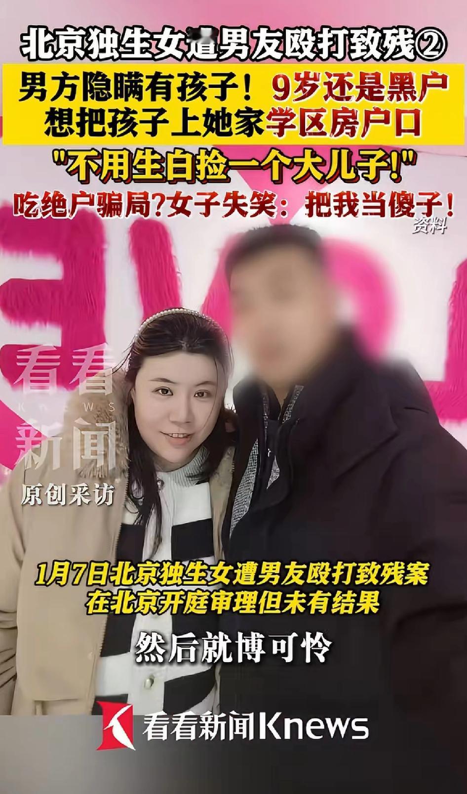 北京独生女遭男友殴打致残,男方隐瞒有孩子!9岁还是黑户,想把孩子上她家学区房户口。不用生白捡一大胖儿子!又一吃绝户案例,女子失笑,把我当傻子。 涉案男子名为杨某(部分媒体报道称其为杨凯),其行为已构成故意伤害。该案于2026年1月7日在北京海淀区人民法院开庭审理,但截至2026年2月27日,法院尚未公布最终的刑事判决结果。 2022年底,小玲结识自称“在北京开公司”的杨某,杨某的殷勤追求让她以为遇到良人。谁能想到,这是噩梦的开始。2023年7月,因争执抢手机,杨某致小玲双手神经损伤;2024年7月,因小玲坚持做手术,杨某再次施暴,致其髋臼盂唇损伤,最终导致小玲无法站立,需靠轮椅出行,被鉴定为一级伤残。 交往中,杨某动手致小玲双手不同程度受伤、双腿无法站立,生活全靠60多岁父母照顾,全家仅靠母亲退休金维持生计。 受害者:小玲(化名),1988年出生,北京海淀人,独生女,家有两套房产。 施暴者:杨某,1980年出生,山西人,有两次犯罪前科(2005年因盗窃被判13年,2021年因侵犯公民个人信息罪被判1年3个月)。 更过分的是,杨某一直隐瞒有案底和孩子的事实,还想把9岁黑户孩子户口落到她家学区房上。一开始杨某都是有预谋的,杨某追小玲也是看中了对方独生女的身份,又有学区房户口,所以杨某看上的只是小玲的北京户口和两套房产,所谓的“感情”不过是男方的图谋不轨和精心算计的骗局。 杨某本来就有两次案底,不过刻意隐瞒,致使小玲误以为自己偶遇良人,加上北京户口和两套房产,才引起歹人的惦记,最后良人变歹人也让自己身受重伤。 杨某的犯罪动机,他隐瞒婚史、儿子及案底,以“残了就只能跟着我”为由控制受害者,并企图通过婚姻将小玲名下房产据为己有,甚至要求将房产写上其前女友儿子的名字,属典型“吃绝户”案件。 如今“私家侦探”男友又因侵犯公民个人信息罪在山西被抓,这案子就像个不断揭开的黑匣子,不知道还藏着多少丑恶!希望法律能严惩这种人,给小玲一个公道。