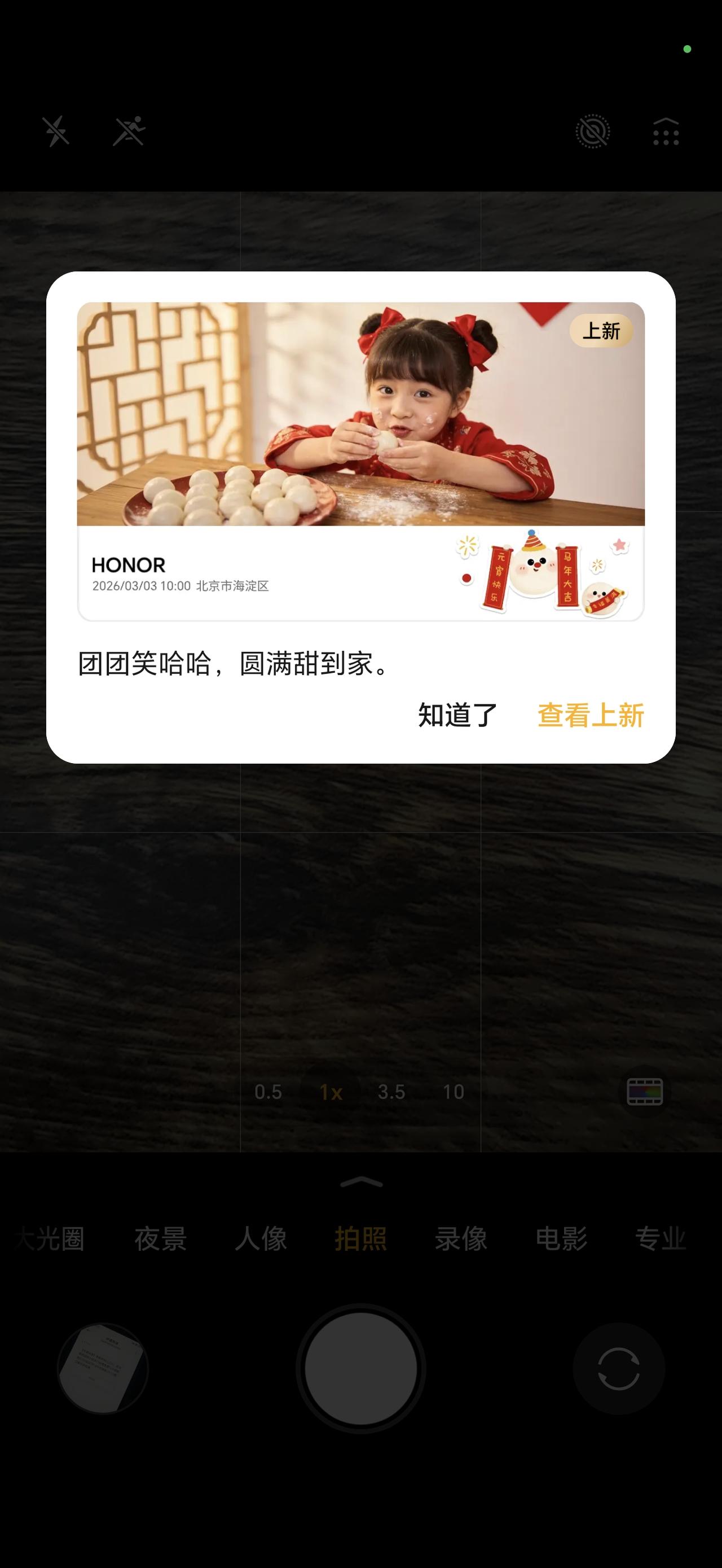 荣耀MagicOS相机水印又上新了,刚刚拍摄照片的时候,自动弹出了相机水印上新的弹窗,属于MagicOS 10.0新春版本的影像功能升级。这次新增了团团圆圆等元宵主题水印,水印上凸显元宵快乐、马年大吉等装饰元素,节日氛围恰到好处 畅聊数码新品 数码资讯