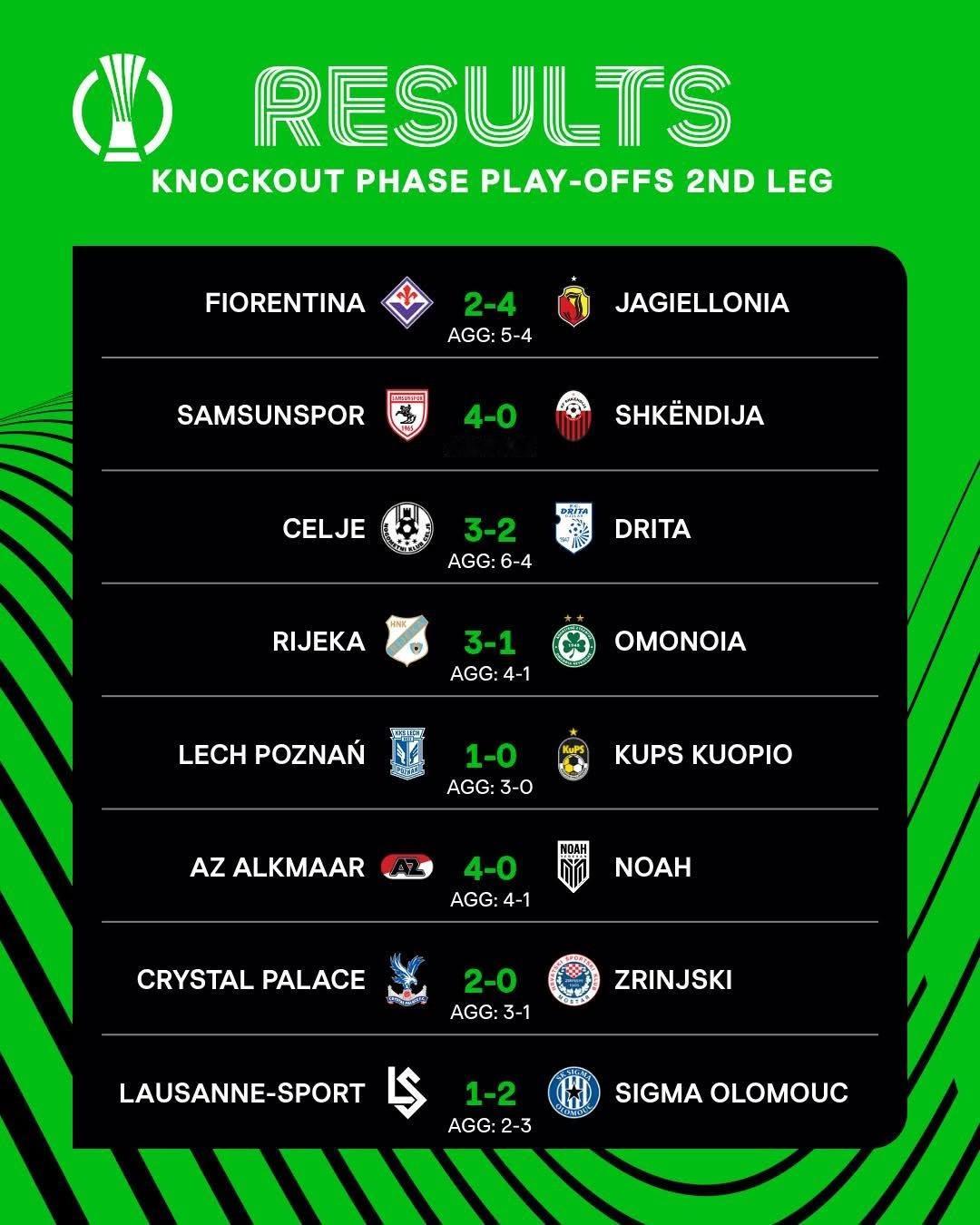 歐洲協會聯賽附加賽次回合賽事賽果-*查積3-2(agg 6-4)迪達*費倫天拿0-3(et 2-1;agg 5-4)查基朗尼亞*列積卡3-1(agg 4-1)奧摩尼亞*森臣士邦4-0(agg 5-0)迪杜禾*列治1-0(agg 3-0)古普斯*艾克馬亞4-0(agg 4-1)諾亞FC洛桑1-2(agg 2-3)*奧隆姆斯*水晶宮2-0(agg 3-1)施連斯基