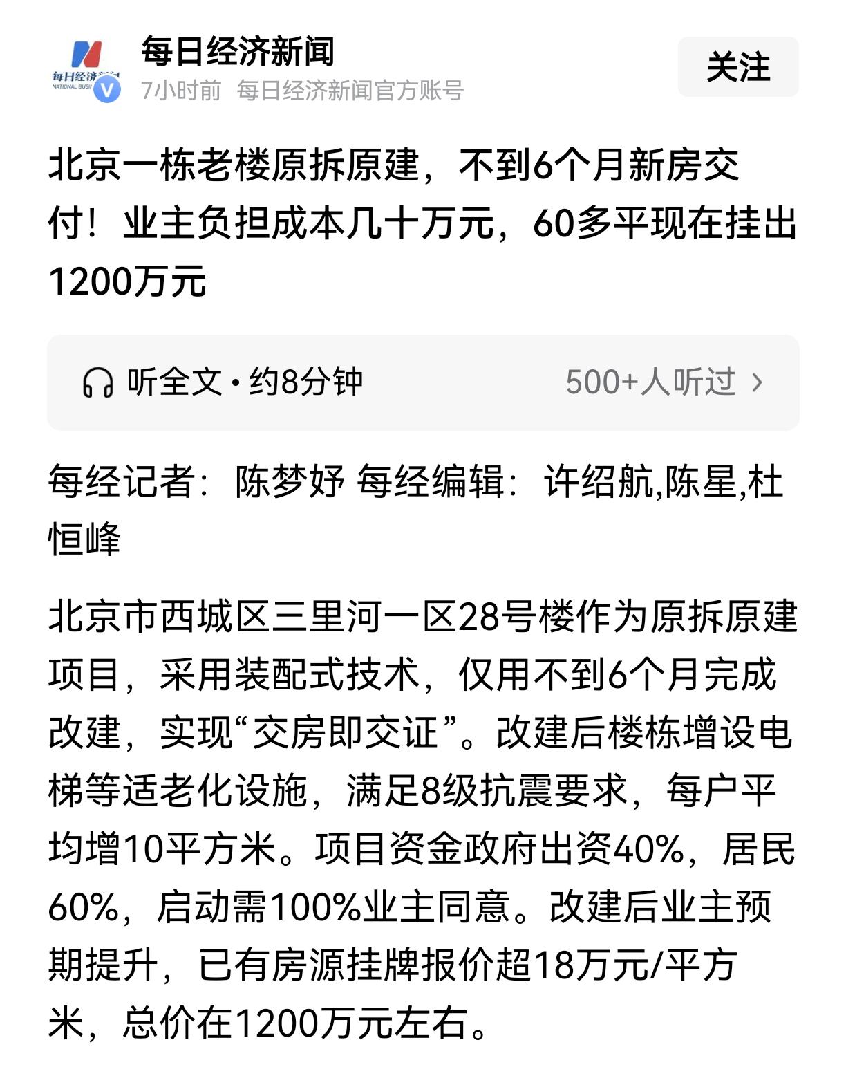 未来那些低于10层的老旧小区将会变得香饽饽,这里面有一个很关键的原因是现在有越来越多的地方允许小区自拆自建。 2024年,北京西城区桦皮厂胡同8号楼和三里河一区28号楼的住户们,做出了一个大胆的决定。 他们不再傻等开发商,也不指望政府全额买单,而是选择了“原拆原建”。简单说,就是自己掏一部分钱,把住了几十年的危楼推倒,原地盖一栋新的。 这听起来像天方夜谭,毕竟盖房子是得花大钱的。但拿桦皮厂胡同的项目来说,当时政府给了政策支持,承担了大约40%的成本,剩下的60%由居民自己凑。 落实到每家每户,大概只需要掏20来万。对于在这个地段生活的人来说,拿出这笔钱虽然肉疼,但也并非掏不出来。真正的难点不在钱,而在人心。 按照当时的规定,想要把楼推倒重盖,必须整栋楼所有住户100%同意。只要有一户人家摇头,整个计划就得泡汤。 邻里之间为了这一个个签字,开了无数次会,磨破了嘴皮子。毕竟要把自家的房产证交出去,还得先垫资几十万,中间还要出去租房住,谁心里没点顾虑?万一烂尾了怎么办?万一钱不够了怎么办? 好在,这群老街坊最终咬牙赌赢了。当最后一个名字签在协议上,奇迹开始上演。 并没有出现漫长的工期拖延,也没有尘土飞扬的常年施工。因为采用了最新的模块化建筑技术,房子的大部分部件都在工厂里生产好了,运到现场直接像搭积木一样组装。 三里河那个项目,从进场拆除到最后新房封顶,仅仅用了几个月的时间。这种速度,让周围还在观望的小区住户看得目瞪口呆。 等到2026年初,当大红的钥匙交到居民手里时,那种震撼是实实在在的。 走进新家,原来昏暗狭窄的格局不见了,取而代之的是宽敞明亮的落地窗,独立干净的厨房卫生间,最关键的是,电梯直接入户。 原本被鉴定为D级危房的破楼,摇身一变成了抗震8度、设施智能的现代化公寓。 更让所有人肾上腺素飙升的,是随之而来的财富效应。钥匙到手的同时,新的不动产权证书也发下来了,产权年限重新按70年计算。 这意味着这套房子和市面上的新盘没有任何区别,可以自由买卖。 几乎是在交房的瞬间,房产中介的电话就被打爆了。原本这种老破小,挂出去都没人多看一眼,价格更是被压得死死的。 可现在有住户试探性地把房子挂牌,价格直接飙到了每平米18万上下。一套房子总价能卖到1200万左右。 而当初他们投入不过是区区几十万,这一进一出相当于净赚了上千万。这种回报率放眼整个投资市场,都是炸裂的存在。原本以为是花钱买个安稳窝,结果却意外砸中了一座金矿。 这就是为什么那些低于10层的老小区,未来会变得如此抢手。 那些动辄二三十层的高层住宅,住户太密,想要把几百户人家的意见统一起来,简直比登天还难。而且高层拆建成本极高,很难有增加容积率的空间。 但低层小区不一样,住户少,大家知根知底,好商量;更重要的是,原来的容积率低,推倒重来后,通过科学设计,往往能多出一些面积或者优化出更好的户型。 这种“自己出钱、政府补贴、原址重建”的模式,正在把老破小从“累赘”变成“潜力股”。它不再依赖开发商的施舍,而是把主动权交回了业主手里。 只要你们心齐,只要政策口子一开,原本不值钱的红砖楼,就能变成核心地段的电梯洋房。 当然,这并不是说所有老小区都能一夜暴富。它需要天时地利人和——政策允许、地段有价值、邻里能团结。 但北京的成功经验,无疑给全国无数正在衰败的低层社区指了一条明路。它告诉我们,房子老了并不可怕,可怕的是人心散了。 如果你的小区也发起了这样的倡议,你觉得最大的阻力会是钱,还是邻居之间的信任?欢迎到评论区讨论
