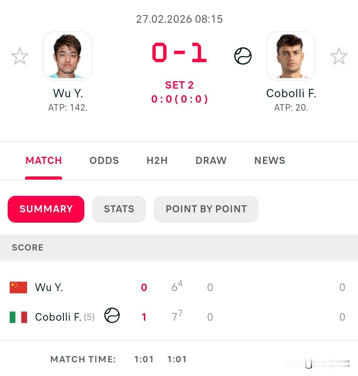🇨🇳吴易昺抢七小分4-7,从而6-7输掉对科博利的首盘。可惜,局分6-5的时