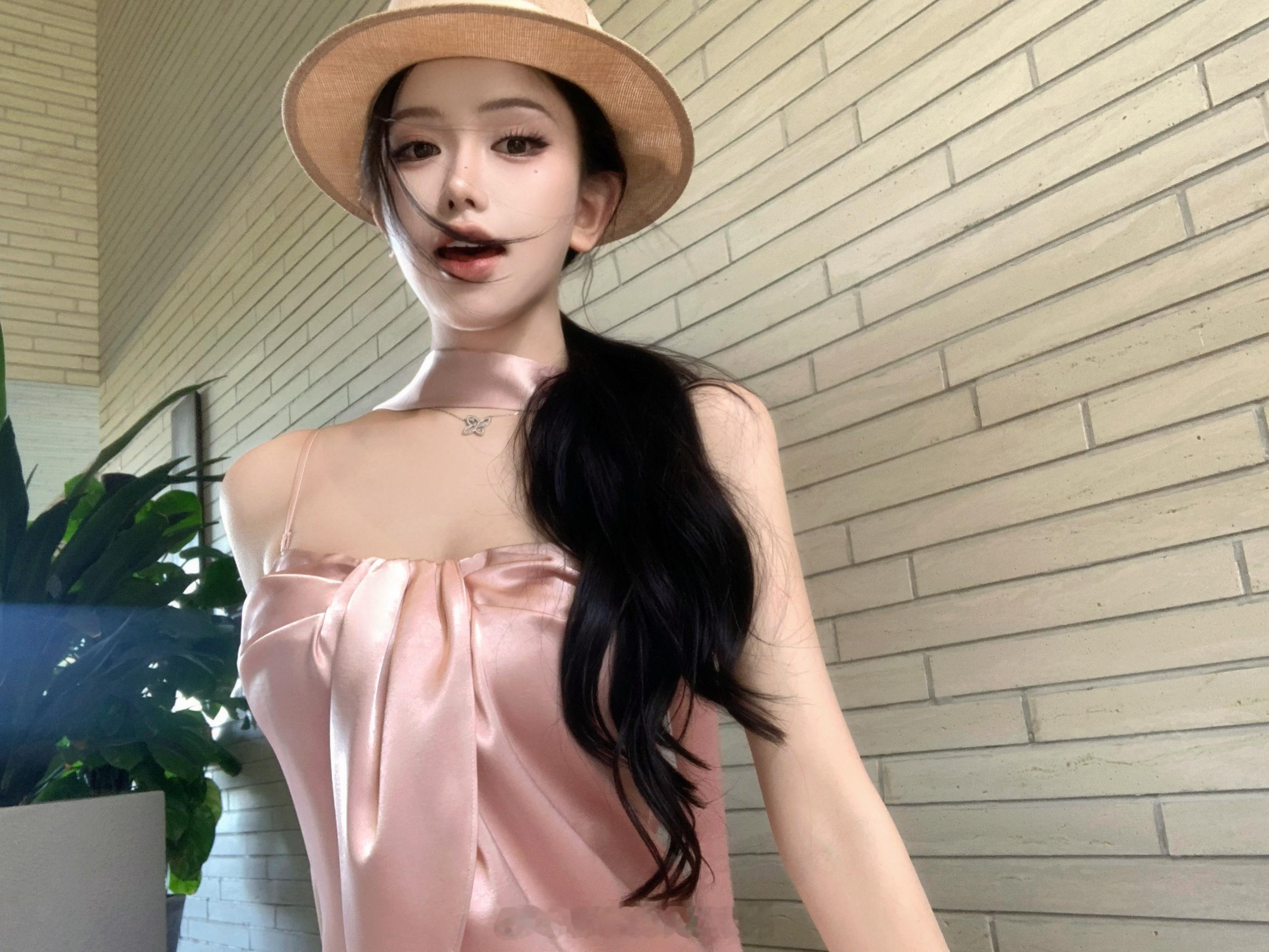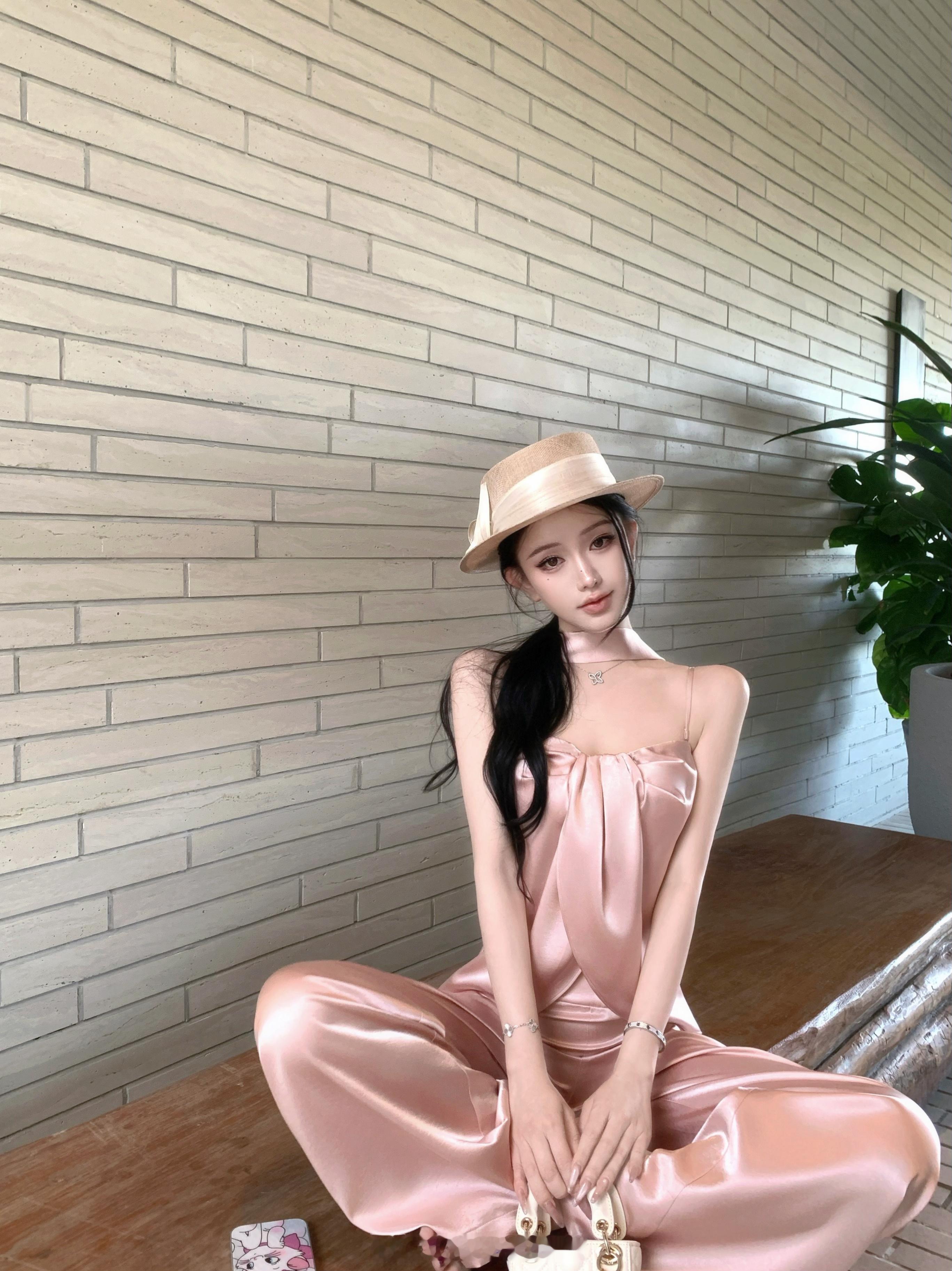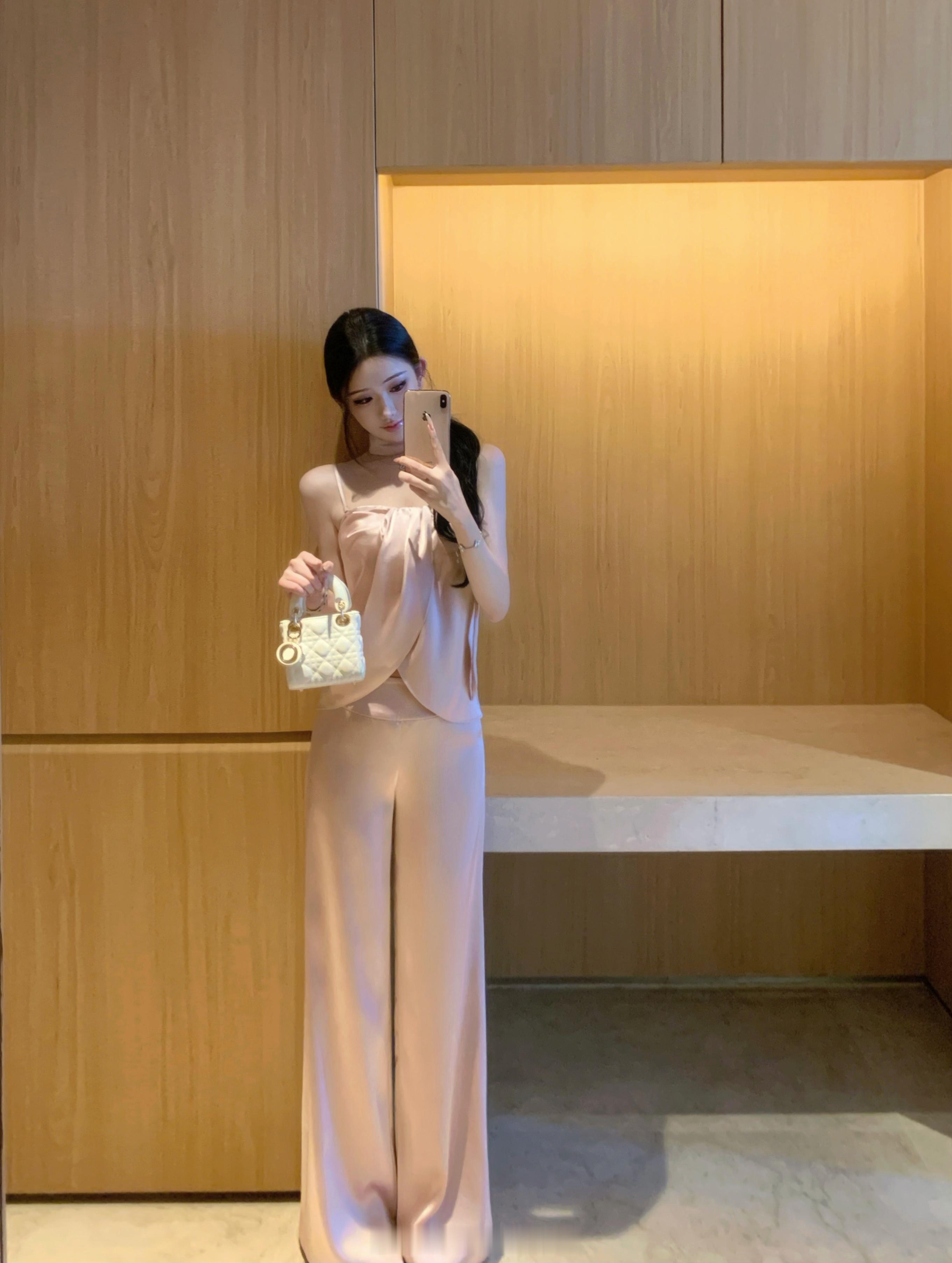 上班暂停 来看看图透缎面套装我来发另一个色啦这套颜色会比莉莉丝更粉一点 加了防滑条和可拆卸肩带 你们可以直接当小吊带穿~