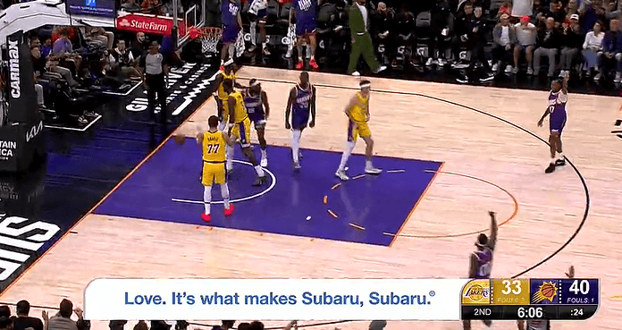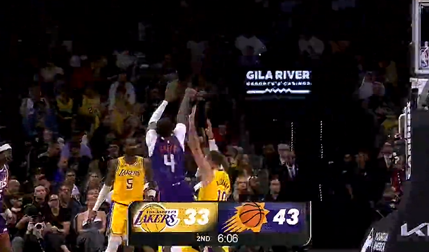 比赛第二节,杰伦-格林打板三分命中,湖人发球失误&被进三分&已落后10分。