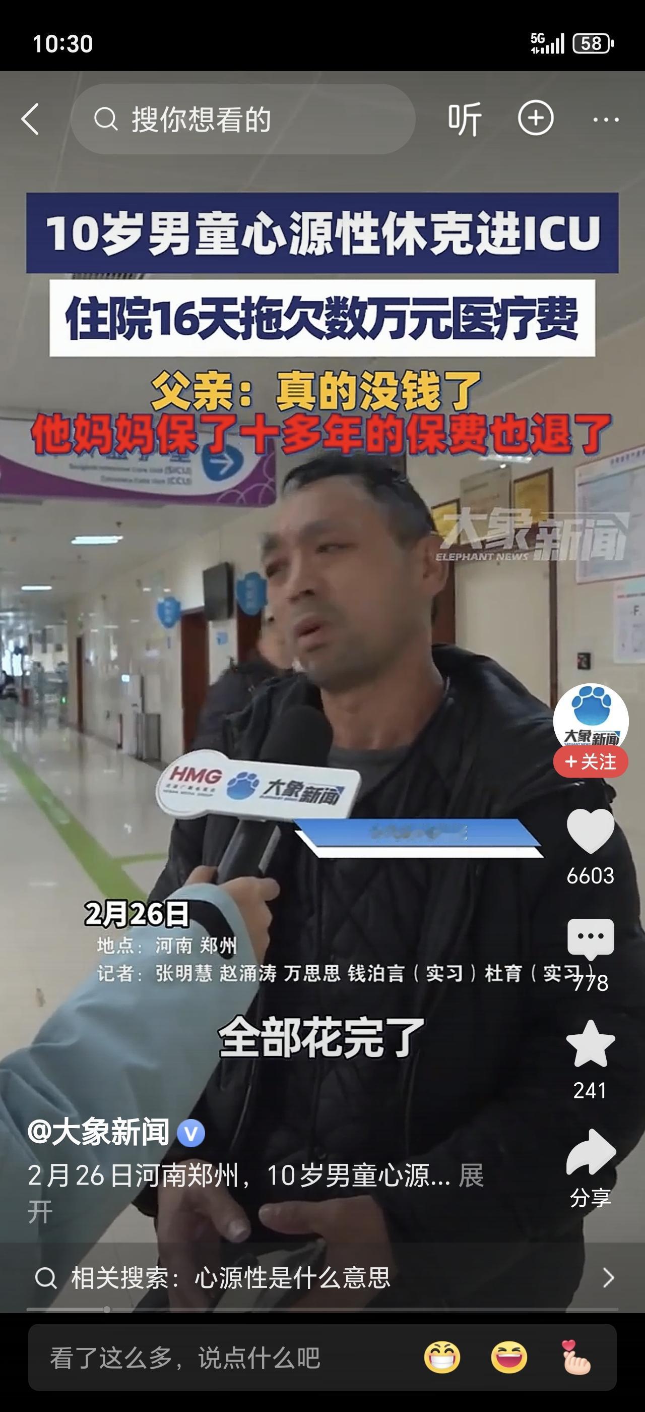 河南10岁男童吃饭时突然呕吐抽搐,送医后直接进了ICU!父亲守在门外崩溃落泪:孩子还有脉搏,砸锅卖铁也要救! 事情发生在2月10日中午,河南平顶山。马先生家正在吃午饭,10岁的小儿子小龙碗里的面条还没吃完,突然开始呕吐,紧接着翻白眼、浑身抽搐。马先生冲过去抱住儿子,“喊他名字没有反应,当时吓得我手都软了,抱都抱不动”。 乡镇医院的医生翻开孩子眼皮看了一眼,直接说:“赶紧去市里!”一家人又慌慌张张往汝州市人民医院赶。当地诊断为心肌炎,医生当即表示没有治疗条件,帮忙联系了河南省儿童医院。 省儿童医院爆发性心肌炎外科监护室主治医师程文哲带队赶到汝州时,孩子的情况越来越差,脉搏一度掉到二三十,根本上不了救护车,撑不到郑州。程医生当机立断——赶在转运前紧急进行ECMO治疗,也就是常说的“人工心肺”! 2月11日凌晨三点,小龙被转运至河南省儿童医院,程医生团队连夜抢救,浑身是汗。“我真的很感谢程医生他们,当时我只能干看着,帮不上啥忙。”马先生声音沙哑,这些天他守在ICU外,没睡过一个整觉。 十岁的小龙已经在ICU里躺了15天,医药费已高达十来万。马先生一家六口全靠他一人打零工维持生计,“每天最多挣个一两百块,家里几乎没啥存款”。他把亲戚朋友借了个遍,又把岳父给妻子买了十多年的保险退了,“虽然很可惜,但那可是一万块钱啊,只要能救孩子,干啥都行”。 程文哲医生透露,医院得知马先生的困难后,多项费用能减免的都减免了,“能帮的就帮一把”。再过两天,孩子状态再好一些,就可以考虑转入普通病房了。 2月26日,大象新闻开启帮扶直播。短短三个小时,上百万网友观看,爱心不断涌入。有人留言问“你们在哪个医院,我想去现场捐款”,有人直接微信转账。直播结束时,马先生的微信里已收到三千多元爱心善款。他拿着手机,声音哽咽,几度落泪:“非常感谢各位网友,你们救了我孩子的命。” 小龙平时活泼好动,连感冒都少见,事发前两天还骑车去同学家玩,谁也没想到会突然得这病。但正是在最绝望的时刻,一群医生把他从死神手里抢了回来,无数陌生人的善意托起了这个摇摇欲坠的家。 如果你看到这样的求助,愿意伸出援手吗?这个十岁孩子的后续治疗费还差很多,评论区聊聊你的看法~孩子哭到昏厥 小儿呕吐 娃儿呕吐 小孩昏迷