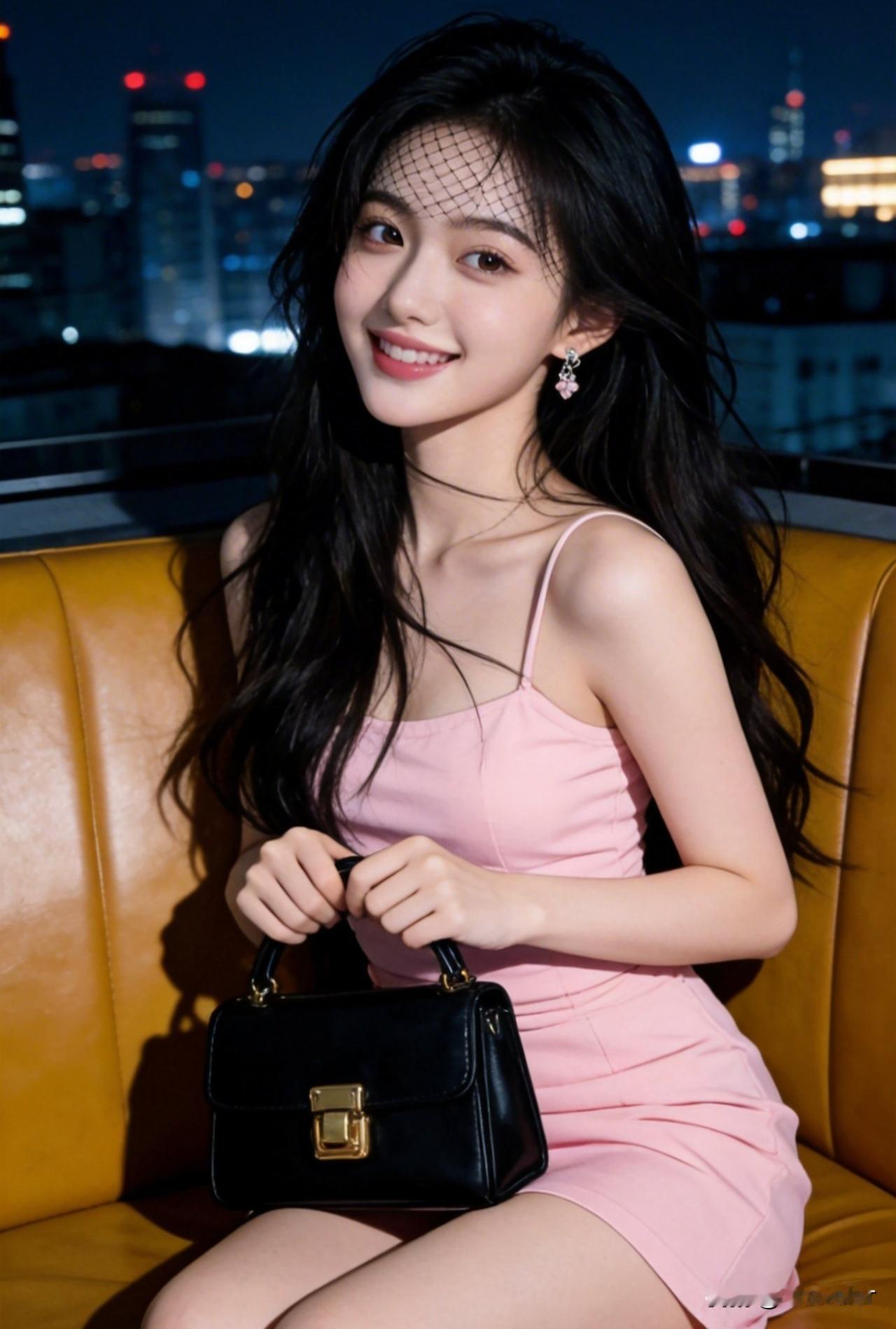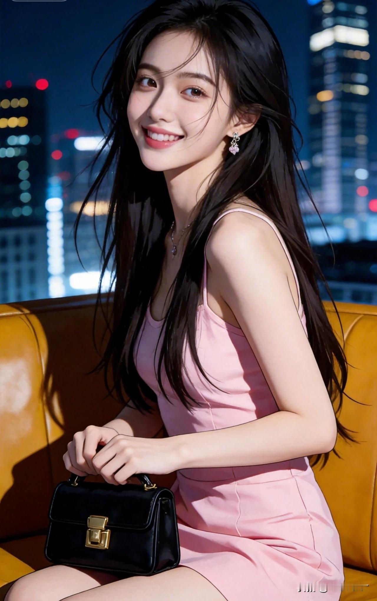 夜晚都市中的甜美少女,粉色连衣裙与黑色手袋相得益彰,笑靥如花。