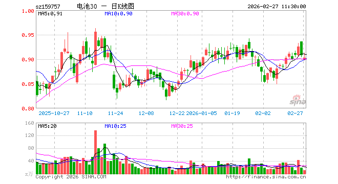 2月27日,截止午间收盘,电池ETF景顺(159757)跌0.55%,报0.903元,成交额965.03万元。电池ETF景顺(159757)重仓股方面,比亚迪截止午盘跌0.70%,宁德时代跌0.55%,三花智控跌1.41%,华友钴业涨0.39%,亿纬锂能跌0.68%,赣锋锂业跌0.34%,天赐材料跌1.11%,先导智能跌0.91%,国轩高科跌0.84%,厦门钨业涨8.20%。
