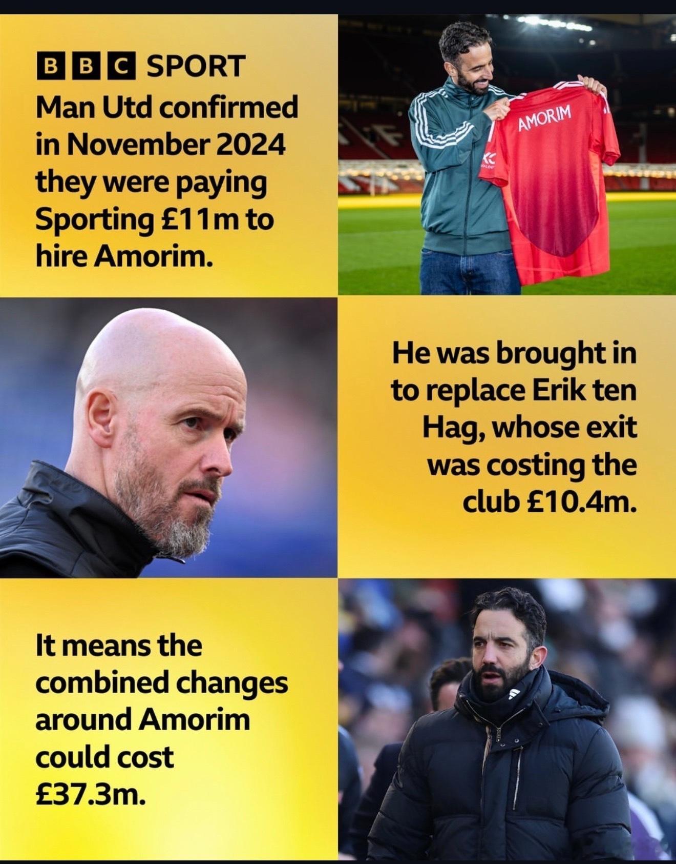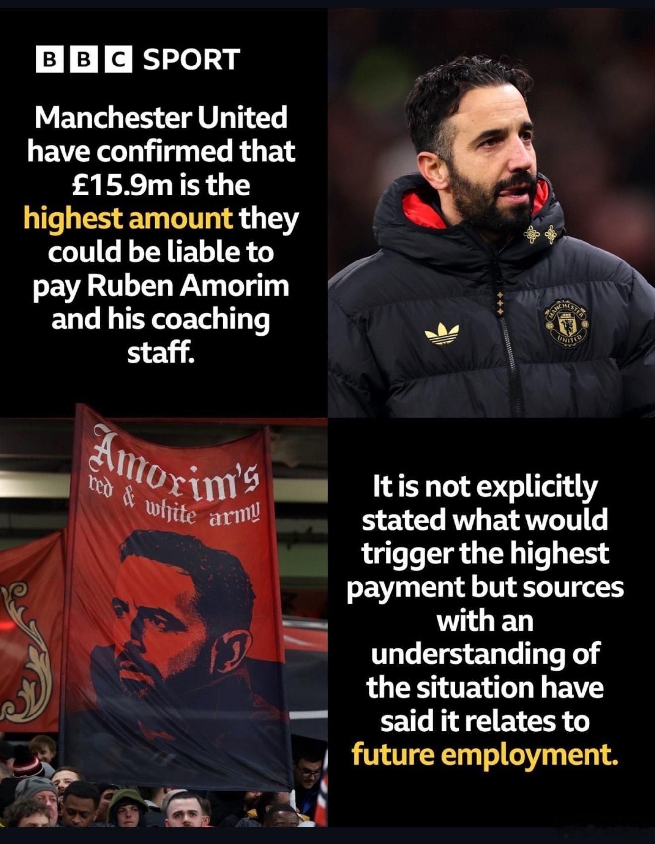 第二,曼联已经证实:解雇前任教练鲁本·阿莫林可能最终花费俱乐部近1600万英镑(图二) 。他们可能需要向鲁本·阿莫林及其教练团队支付的最高金额为1590万英镑。2024 年 上一次曼联换帅的违约金成本,包括了向葡萄牙体育支付阿莫林的 1100万英镑违约金,以及给下课的滕哈赫支付的赔偿 1040万英镑。