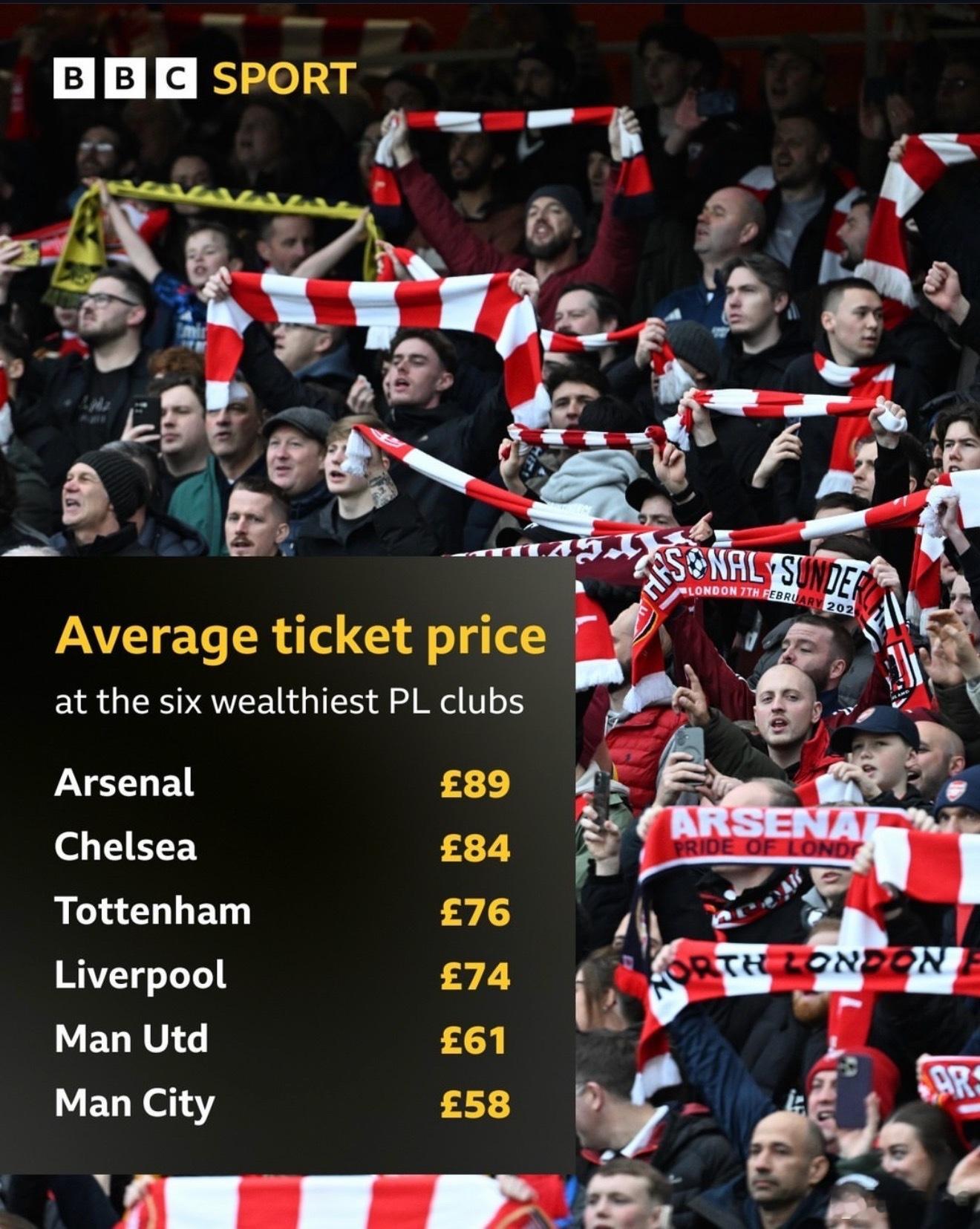 第三个数字是英超球迷单场门票花费的前 6 排行榜,阿森纳以 89 英镑排第一,切尔西 84 英镑排第二,曼联以 61 英镑排第五,曼城以58 英镑排第六。只是这前六名里,其他 5 支英超球队都已晋级本届欧冠 16 强。(图五)
