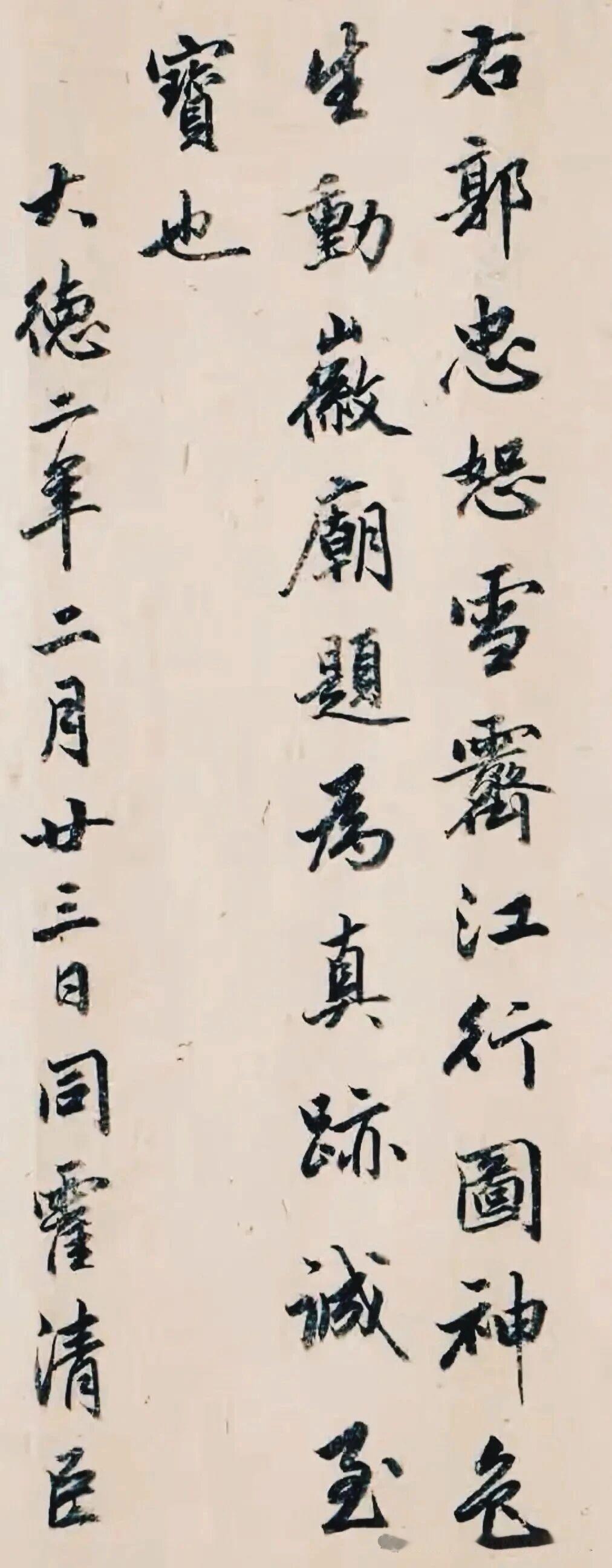 赵孟頫《跋郭忠恕雪霁江行图》 题跋以简洁笔墨直指画作核心:“神色生动”四字精准概括郭忠恕界画的精妙——线条遒劲工整,雪景江船的意境空灵静谧,人物情态暗藏生机,连宋徽宗都御笔认证为真迹,足见其艺术分量。赵孟頫并未堆砌辞藻,而是以亲历者视角,记录了大德二年与霍清臣、周公谨等文人同赏画作的雅事,既点明了画作的流传脉络,也勾勒出元代文人的赏画风尚,为《雪霁江行图》的真伪与价值提供了直接佐证。