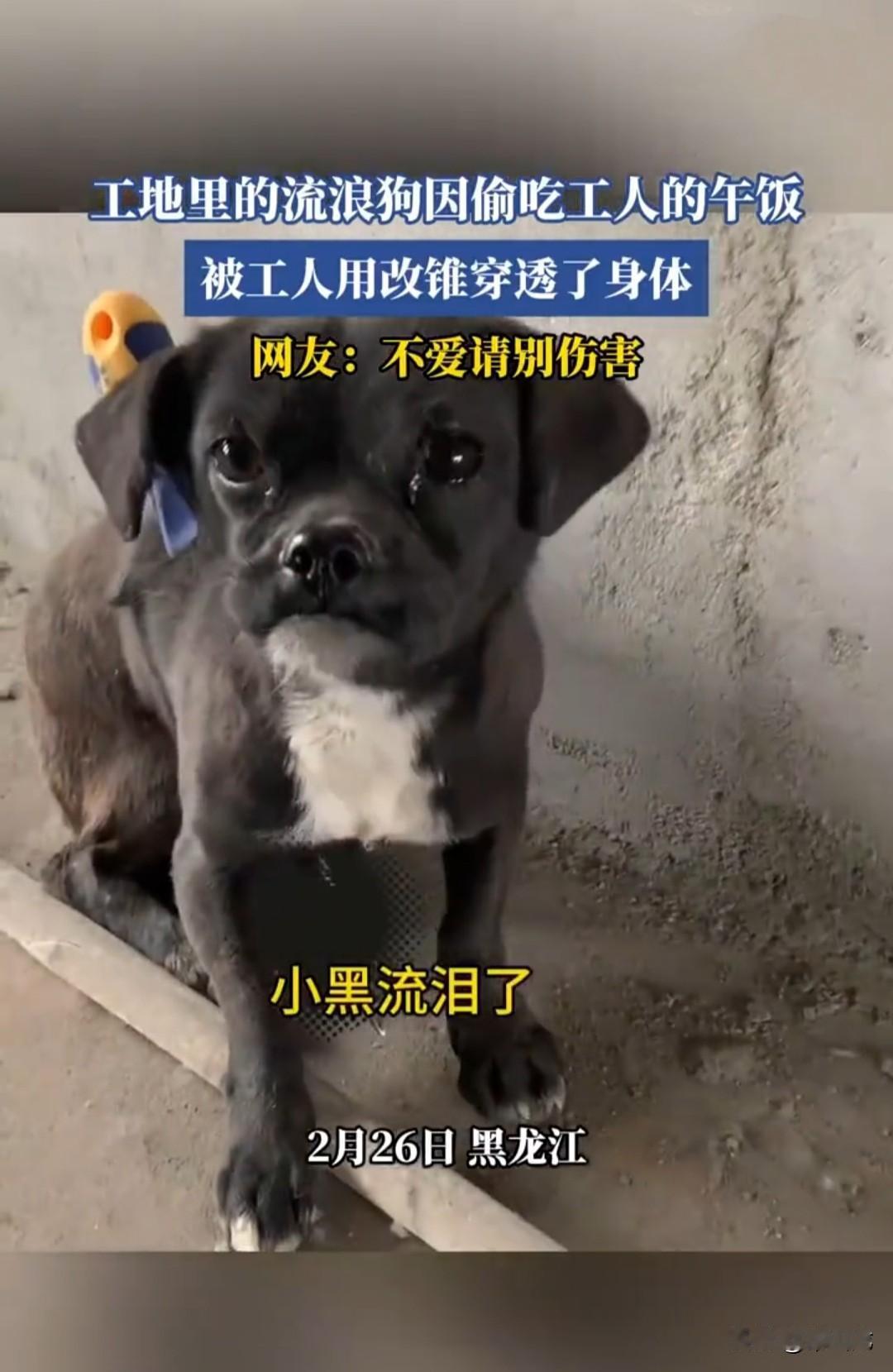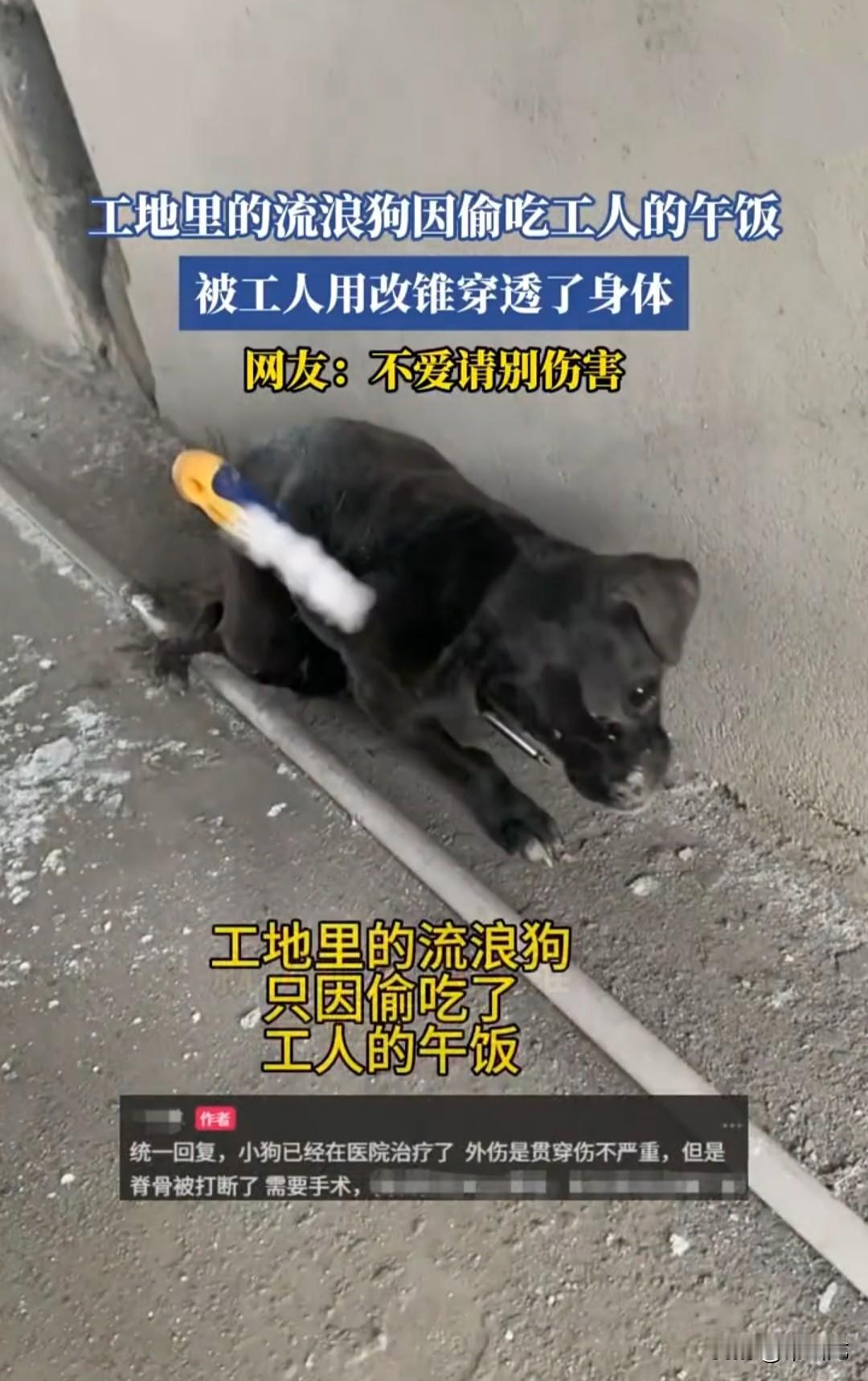 流浪小黑狗因为偷吃工人的午饭,竟然被工人用尖嘴螺丝刀残忍地扎穿身体。 视频中,一