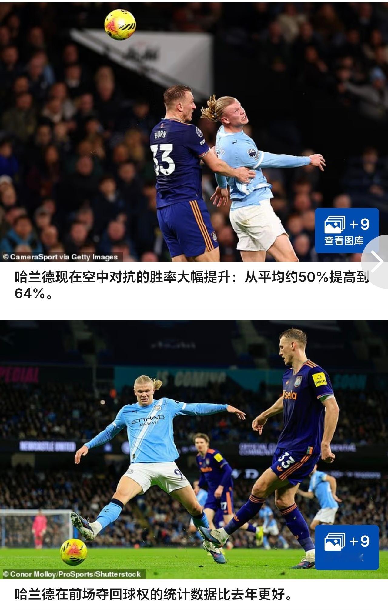 英超曼城 《每日邮报》:上周末曼城险胜纽卡斯尔联后,围绕哈兰德场上表现的讨论再次掀起。部分观察人士称这是他职业生涯至今最全面的一场比赛,鲁尼也对其表现大加赞赏。“这是一场我永远不会忘记的比赛。”瓜迪奥拉表示。在曼城2-1取胜后,他已在更衣室里将哈兰德树立为全队榜样。这番表态的核心,是希望全队记住哈兰德为球队付出的一切:他的投入、斗志与渴望。若想力压阿森纳夺得联赛冠军,这种态度对曼城而言不容妥协。哈兰德拼尽全力,奔跑、防守、逼抢,如同着了魔一般。他将高大后卫丹·伯恩撞得东倒西歪,仿佛对方只是个身材单薄的新秀。比赛最后时刻,正是他头球解围了一粒极具威胁的角球。此役他虽未进球,却为奥赖利的第二粒进球送出一脚绝妙助攻——右脚传中吊向后点。奥赖利头球破门时,哈兰德注视着进球,随即飞奔过去与队友一同庆祝。“你能看到,队友成功时他发自内心地开心。”挪威国家队主帅索尔巴肯在接受《每日邮报》体育版采访时说道,“这充分证明他是一名真正的团队型球员。”这些年来,哈兰德的团队精神甚至让部分曼城队友感到意外;也正是这一特质,让瓜迪奥拉在去年夏天赋予他更多责任。对阵纽卡斯尔的数据足以说明一切:12次对抗,创下职业生涯新高;英超单场43次触球,同样是个人纪录;曼城队内解围次数最多——尽管具体数据会因统计口径与解围定义不同而略有出入。他在中圈附近的平均站位,比另一名前锋马尔穆什回撤了约20码。这是瓜迪奥拉近几周采用双前锋+菱形中场战术的结果。“等边锋(多库、萨维尼奥)回归后,我们再看怎么安排。”曼城主帅表示,“我认为他适应得非常完美。我可没让哈兰德去踢左后卫。”这些细节都标志着一名全能中锋的成型——风格更接近凯恩,而非C罗。而这已成为一种趋势。本赛季,关于哈兰德球风蜕变、从“只”疯狂进球转变为更多服务团队的讨论,至少已出现四次。客平阿森纳、9月德比击败曼联(赛前哈兰德在提升球队标准的会议上扮演核心角色,此役他的防守动作甚至多于对阵纽卡斯尔一役)、主场战胜伯恩茅斯后,每次出色表现都引发外界对他风格的热议,就连酒吧里的看客也会认真说道:哈兰德早已不只是进球机器了。这种关于他在进球之外不断进步的讨论反复出现,且每次都被当作新发现,不禁让人发问:他难道一直都是这样吗?答案是,既是也不是。肉眼可见,他已逐渐成为曼城由守转攻的关键一环,而这往往比冰冷数据更具说服力。头球争抢与球队对他身高优势的依赖度大幅提升——提升幅度相当惊人。这是哈兰德长期打磨的环节,尤其是在多特蒙德与罗泽共事期间,他深知这一能力必须精进。尽管他每90分钟的空中对抗次数仅小幅上升:本赛季3.9次,上赛季3.55次,处子赛季3.2次,但曼城收获的效果却好得多。哈兰德如今的争顶成功率高达64%,远高于此前约50%的平均水平。他的盘带数据也呈上升趋势。本周,曼城视频团队将他对阵纽卡斯尔时一次灵巧的连续过人做成了慢镜集锦。他场均尝试过人次数增多,成功率达到40%。但其他数据则喜忧参半:前场夺回球权的表现好于上赛季,却不及2023-24赛季;送入禁区的传球次数仅为三冠王赛季的一半;预期助攻与前三个赛季基本持平,运动战创造机会次数甚至创下新低——尽管直塞球远高于平时均值。曾被批评者紧盯不放的场均触球次数,低于前两个赛季:本赛季24次,惊艳处子赛季则为27次,当时不少人嘲讽他参与度太低。不过这是全赛季数据,并非曼城缺少边锋的这段时期。说到底,足球本就是件奇妙的事。曾有一场对阵摩纳哥的比赛,他直到第15分钟破门才第一次碰到球,却没人对此说三道四。很多时候,惊人的进球数掩盖了他的其他特质。或许随着进球神迹带来的震撼逐渐消退,评论员们开始寻找他球场上其他值得称道的地方。事实上,为团队付出对哈兰德而言从来不是新鲜事。最近的例子便是去年10月客战比利亚雷亚尔,他一次精妙的佯攻跑位吸引了福伊特的防守,为贝尔纳多·席尔瓦破门创造空间,尽管回撤接球是近期才更多出现的习惯。2023年与阿森纳的争冠关键战中,他强硬对抗萨利巴与加布里埃尔,堪称脏活累活一肩挑的经典表现;而在今年6月挪威对阵意大利的世界杯预选赛关键战里,他的逼抢、边路穿插与拿球能力,也让挪威教练组赞叹不已。战术层面,大家能看到他对比赛需求的理解愈发清晰,尤其面对纸面实力更强的对手时。这或许就是今年的不同之处:数据相差无几,但他学会了如何更好地利用机会,带动身边队友。即便以22球领跑射手榜,他也并非一帆风顺。新年前后经历了一段进球荒,至今仍未完全走出低谷。在安菲尔德球场,身着拖鞋走出更衣室的哈兰德坦言,自己的状态“没有任何借口”。近10轮联赛,他运动战仅打入1球。他拒绝将此归咎于疲劳,尽管瓜迪奥拉直言他“已筋疲力尽”,并尽可能安排他休息——上月战胜狼队的比赛,哈兰德便坐上了替补席。目前哈兰德正处于搬家过渡期,全家暂时搬到克鲁附近,对阵纽卡斯尔后的三天假期里,他去了巴黎待了一段时间。接下来的对手是利兹联——他的出生地。曼城下半程的冲刺就此拉开序幕。毫无疑问,曼城现在需要他重新找回稳定的进球效率。瓜迪奥拉也坦诚谈起这位9号球员给自己施加的压力。“埃尔林的问题在于,他必须面对自己创造
