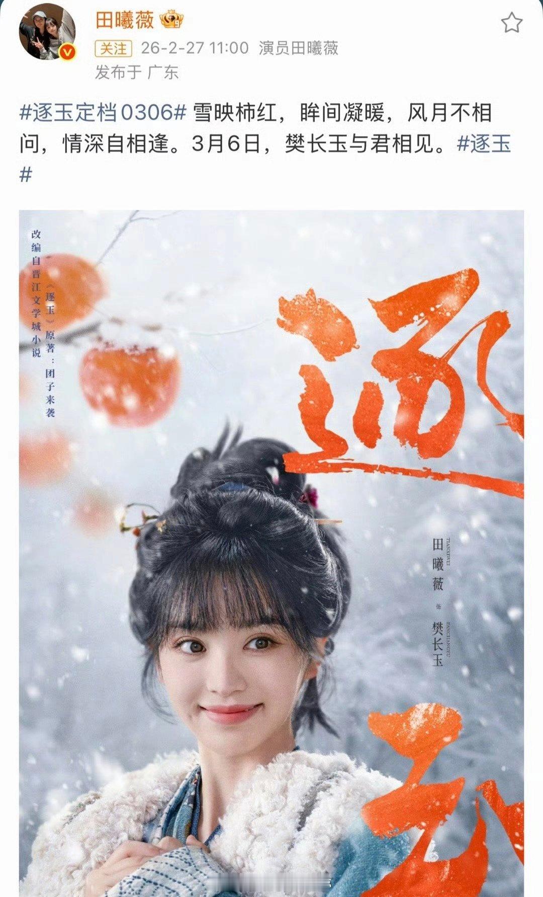 张凌赫田曦薇《逐玉》今天定档!燥候3月6号!逐玉定档0306