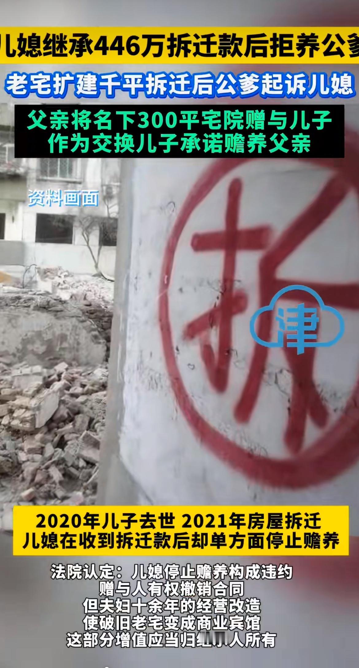 “吃相太难看!”儿媳继承446万拆迁款后,居然直接拒绝赡养公爹!十多年前老爹赠房时说好儿子养自己到老,儿子走后儿媳却翻脸不认人。这拆迁款里有700多平是儿媳和亡夫辛苦扩建的,到底该不该分给公爹?法院最终怎么判? 十多年前父亲程某把自己名下大概300平方米的宅院赠给了儿子,不过有个条件,儿子得承担父亲全部的生活费和医疗费,双方还签了赠与合同。 儿子拿到房产后,和儿媳一起花了不少钱对老宅进行翻建扩建。原本的民房被改造成了商业宾馆,房屋面积一下子从300平方米飙升到了1000余平方米,这里面新增的面积就有700多平方米。这十多年里儿子儿媳用心经营,把原本破旧的老宅变成了能赚钱的商业宾馆,一家人日子过得也算安稳,儿子也一直按照约定承担着父亲的生活费和医疗费。 可天有不测风云,2020年儿子突然离世,这对这个家庭来说是个沉重的打击。2020年5月父亲程某在公证处做了放弃继承权声明书,明确表示放弃对儿子程丁某遗产的继承权。就在同一天儿媳赵某和子女通过继承获得了这处房产。当时大家都觉得事情就这么定下来了,以后各自过各自的生活。 然而2021年伊宁市政府启动棚户区改造项目,这处房产被纳入拆迁范围,赵某领取了高达446万元的补偿款。这本来是件好事,可钱到账后矛盾就爆发了。从2021年8月起赵某停止承担公爹程某的生活费和医疗费。这就意味着十多年前那份赠与合同里约定的赡养义务,在儿子去世一年后,被儿媳单方面终止了。 这可苦了年逾八旬的程某,没了生活费和医疗费,生活一下子没了保障。他一气之下一纸诉状将儿媳告上了法庭,要求撤销当年的赠与合同。 一审和二审法院都支持了程某的诉求,判决撤销赠与合同,要求儿媳返还补偿款的50%,也就是223万余元。可检察机关抗诉后案件进入再审,争议的焦点就集中在了新增的700多平米面积的归属上。 法庭上双方都拿出了自己的证据。儿媳赵某出示了建房合同、付款收据等,想证明新增面积是自己和亡夫的心血,是他们投入了大量资金和精力才建成的。而程某虽然声称自己也出资了70余万,但却拿不出凭证,空口无凭,在法律上很难得到支持。 经过一番波折2025年12月新疆高院作出了终审判决。法院认为继承人继承财产必须继续履行附随义务,儿媳停止赡养的行为构成了违约,赠与人也就是程某有权撤销合同。不过考虑到夫妇二人这十余年的经营改造,让破旧老宅变成了商业宾馆,这部分增值应该归继承人所有。所以总补偿款446万余元,老父亲获得原始面积对应的67万余元,其余300多万增值部分归儿媳所有。 在涉及财产赠与和继承的时候,一定要把各种权利和义务明确清楚,最好能留下书面证据,避免以后产生不必要的纠纷。毕竟亲情和财产一旦纠缠在一起,就很难理得清。 大家对这起案件有什么看法呢?欢迎在评论区留言讨论。要是觉得这篇文章有意思,别忘了点赞转发,让更多的人看到,关注我,后续还有更多精彩内容等着你!年底的快乐是卡罗拉给的 问界M9祝您新年手到福来 来源:津云新闻