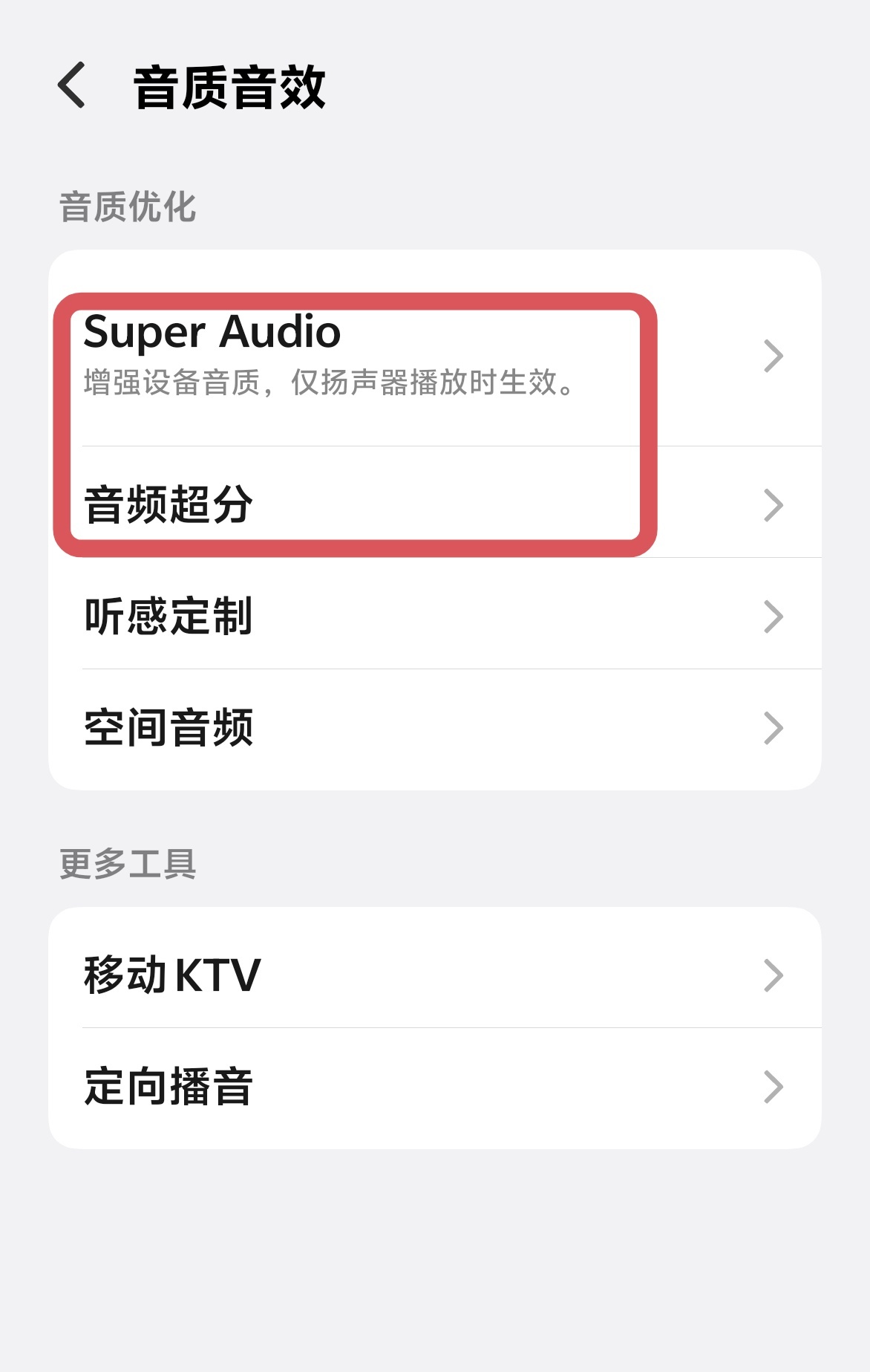 在设置里面打开声音与振动,下滑打开音质音效,选择super Audio和音频超分